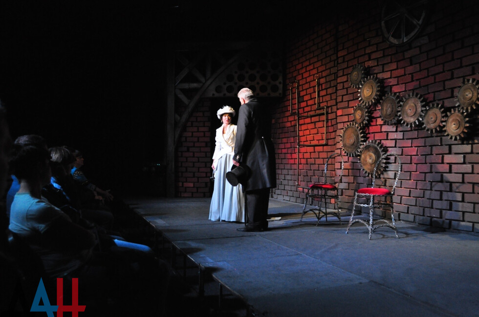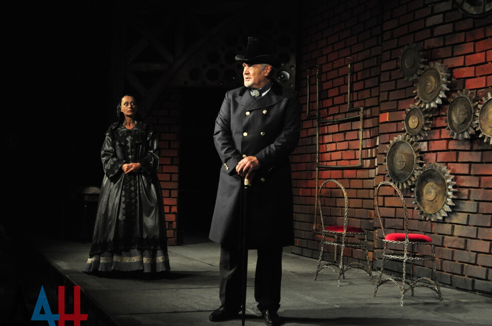 Заслуживает внимания и оформление спектакля. Центральной деталью являются шестеренки на кирпичной стене. В напряженные моменты они начинают вращаться, при этом звучит металлический шум, предрекая неизбежную трагическую развязку.