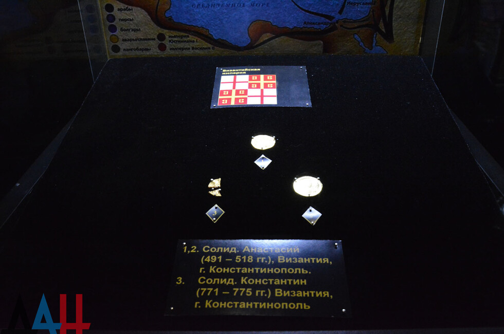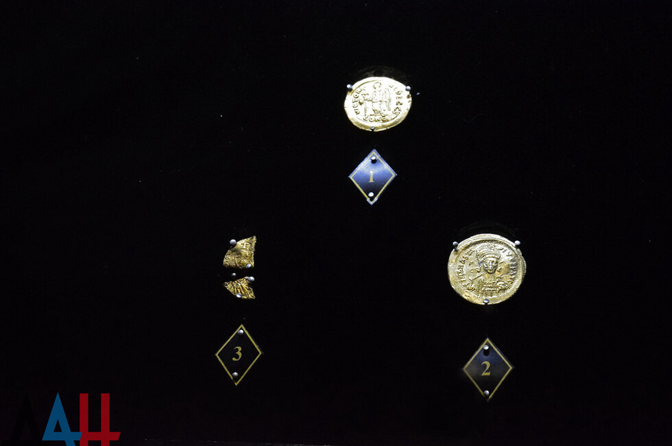 города Ольвия; древнеримские монеты III века нашей эры и другие. Центром экспозиции данной части зала стал византийский золотой солид (относящийся к периоду правления императора Анастасия (491-518 годы), найденный археологами при раскопках в Новоазовском районе.