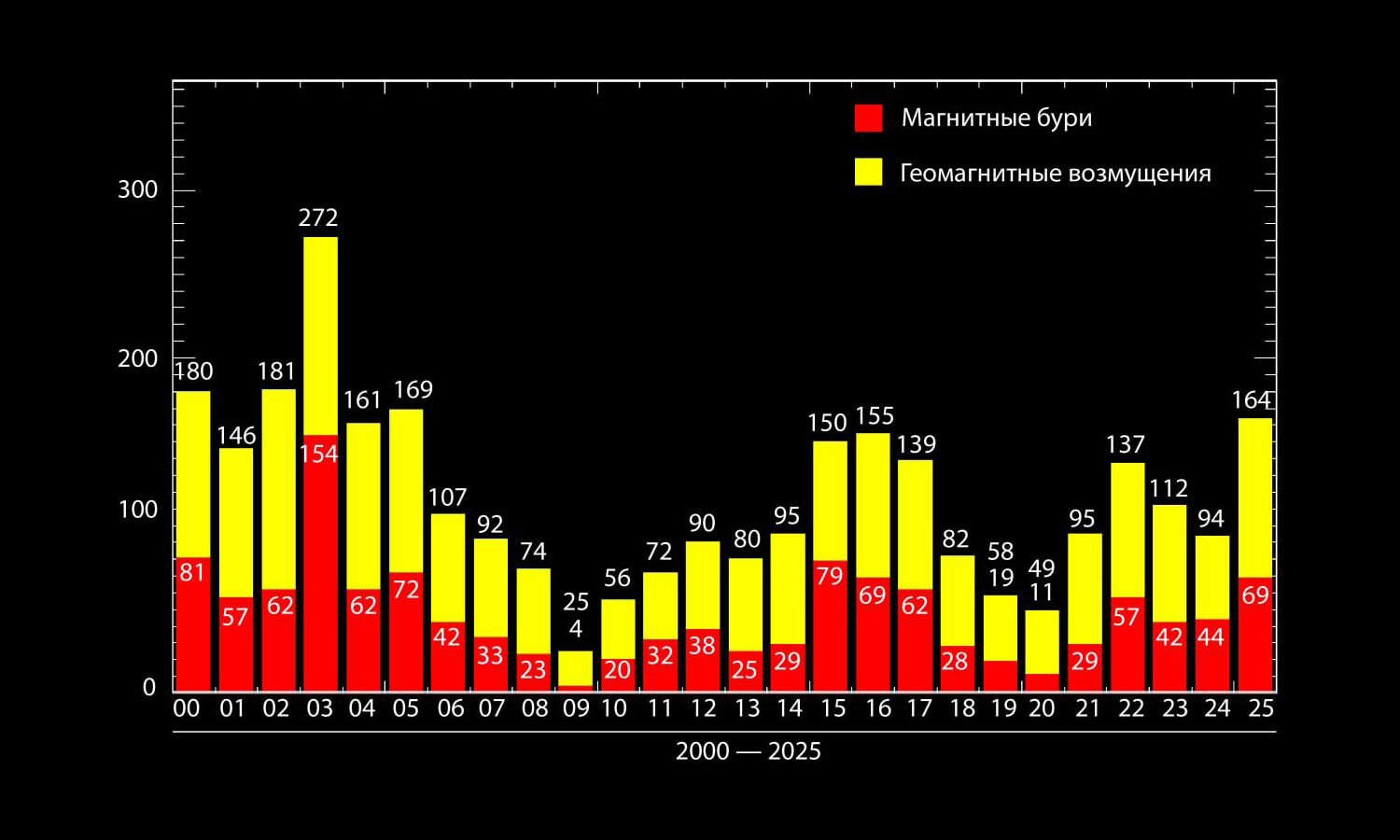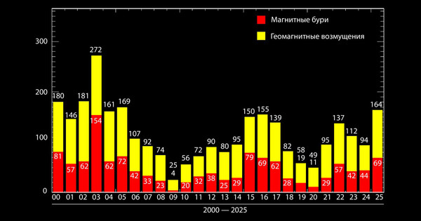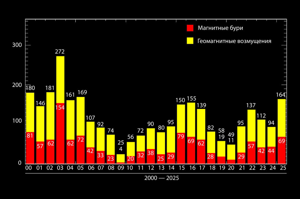 «Абсолютным рекордсменом XXI века является 2003 год, когда было зарегистрировано 272 геомагнитно-возмущенных дня из 365, в том числе 154 дня с магнитными бурями. А вот абсолютным минимумом XXI века является 2009 год. За 365 дней тогда было зарегистрировано только 4 магнитные бури», — заключили там.