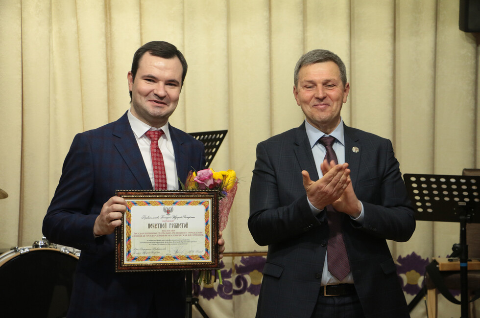 Министр наградил почетной грамотой Правительства коллектив столичной филармонии за добросовестный труд, высокое профессиональное мастерство и личный вклад в развитие искусства. Благодарностями Правительства были отмечены заместитель гендиректора по концертной работе данного учреждения культуры Дмитрий Карась и артист Донецкого государственного академического симфонического оркестра имени С.С. Прокофьева Сергей Спивак.