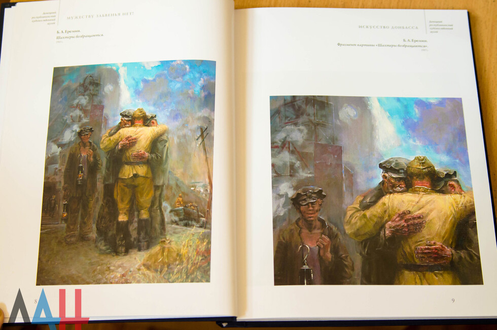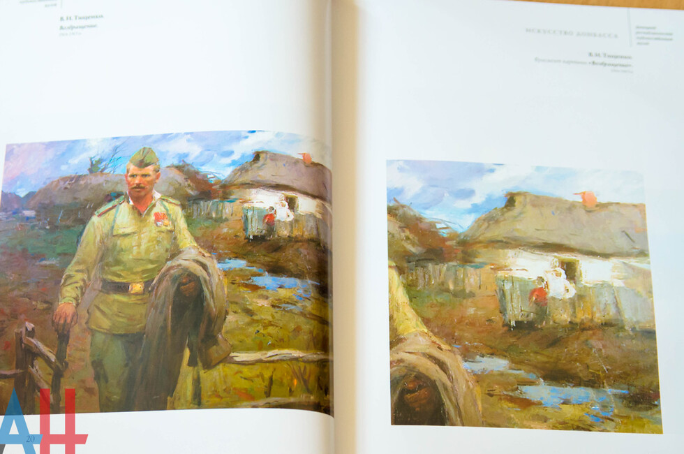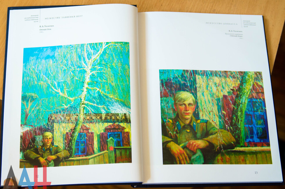 В альбоме, который насчитывает 165 страниц, представлены живопись и графика о событиях Великой Отечественной войны. На титульном листе размещено приветствие Главы ДНР Александра Захарченко. Тираж издания насчитывает 500 экземпляров, которые будут распространены между 50 детскими библиотеками Республики.
