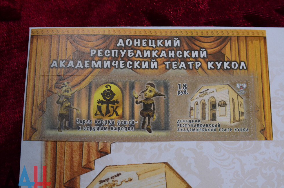 На марке изображено здание театра, герб Донецкой Народной Республики и год выпуска – 2018. Марка стоимостью 18 рублей выпущена тиражом 14 000 экземпляров. На конверте Первого дня также нанесен театр и элемент занавеса, а на художественном немаркированном конверте – кукольные персонажи Мальвина и Буратино.