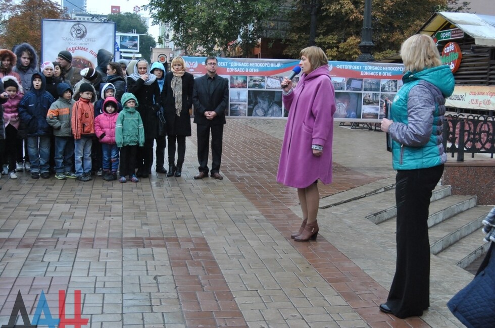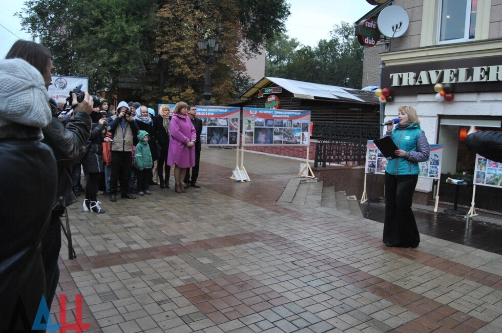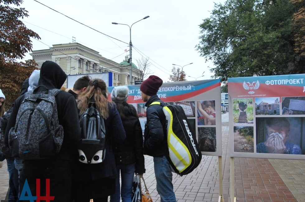 Донецк, 14 окт - ДАН. Фотовыставка «Донбасс непокоренный» открылась сегодня на улице Артема в Донецке. Проект был реализован при поддержке министерств обороны, образования и науки, а также информации ДНР.