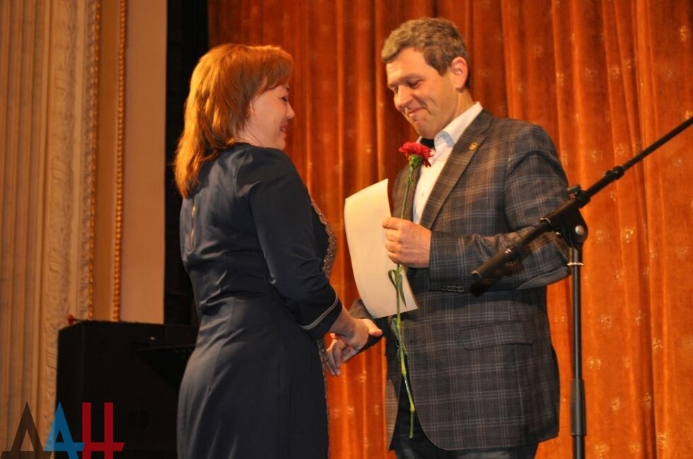 Почетные грамоты и благодарности были вручены как актерам, так и другим работникам театра – администраторам, осветителям, рабочим сцены, уборщикам. Директор муздрамы Наталия Волкова выходила на сцену дважды. Первый раз – чтобы получить почетную грамоту Главы ДНР, а второй – чтобы вручить своим сотрудникам благодарности от Союза театральных деятелей, председателем которого она является.