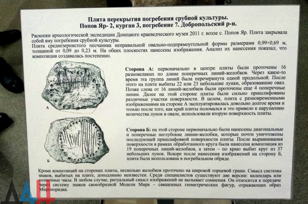 Еще одним заметным экспонатом нового зала ДРКМ стал древний календарь, найденный экспедицией музея при раскопках курганов на стыке Добропольского и Константиновского районов в 2011 году. Одна из могил была накрыта каменной плитой, что нередко встречается в погребениях позднего бронзового века. Но когда археологи подняли плиту и очистили ее от земли, то увидели нанесенные с двух сторон знаки.
