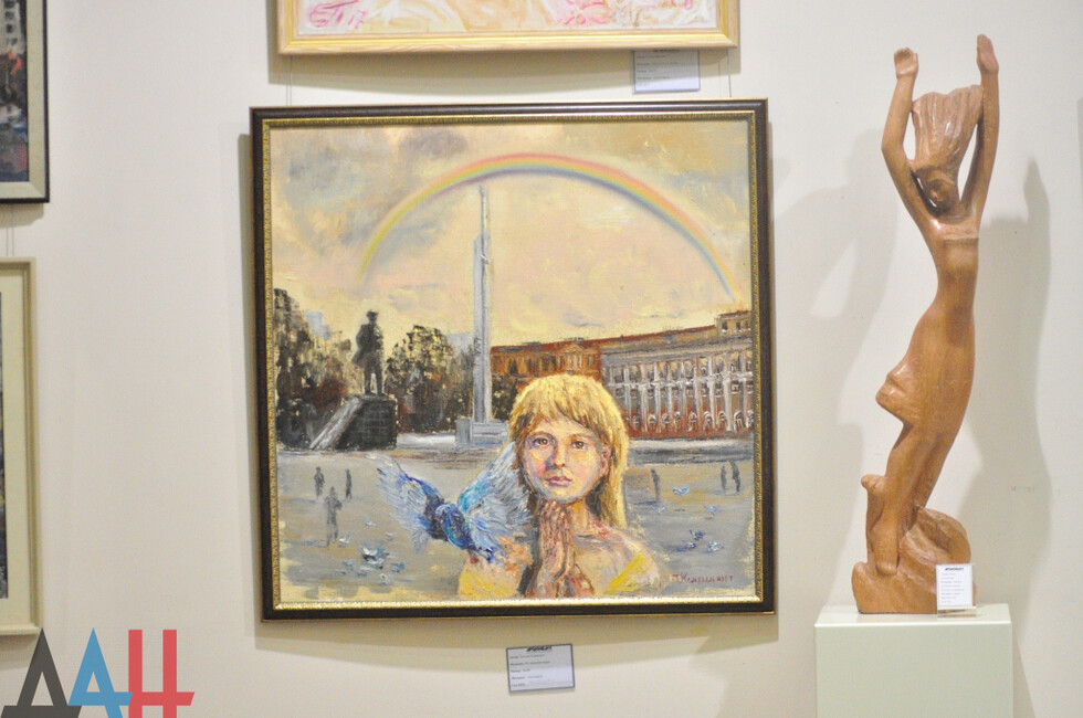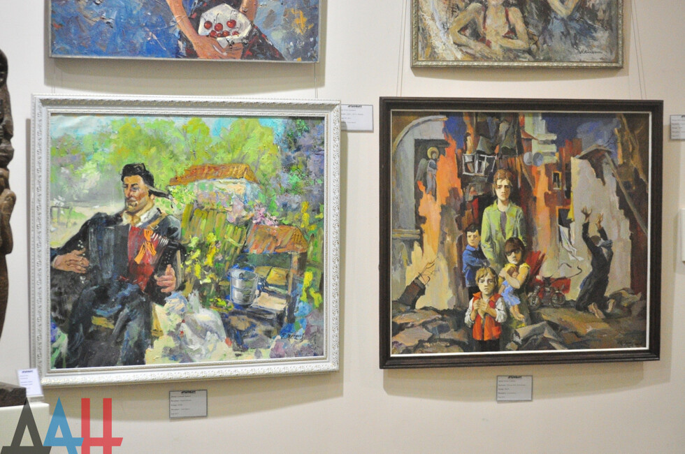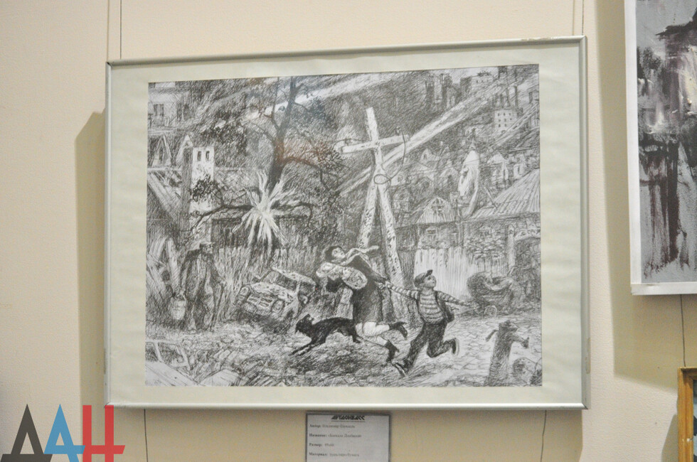 Отдельное место в экспозиции занял триптих художника Владимира Пауэра, повествующий о животных, которые с началом войны стали бездомными или погибли. Работы Татьяны Комендант посвящены детям, обращающихся к Богу с просьбой вернуть мир на Донбасс. Также были представлены 25 плакатов в честь металлургов и шахтеров, как символ будущего Республики.