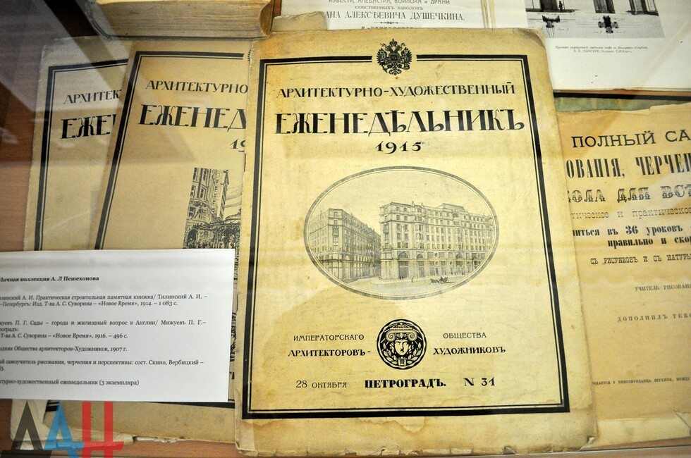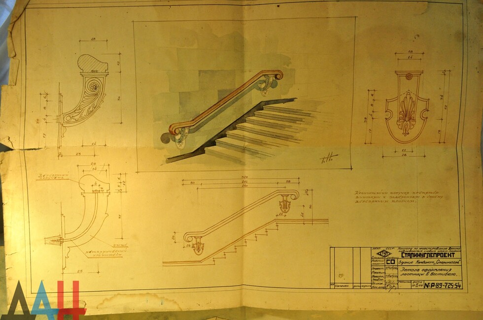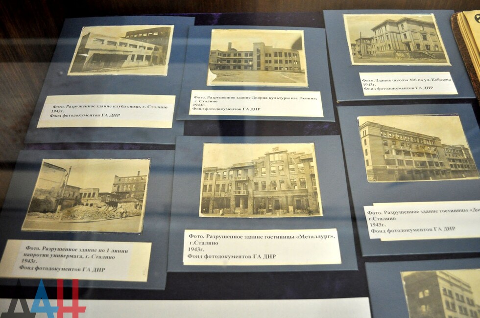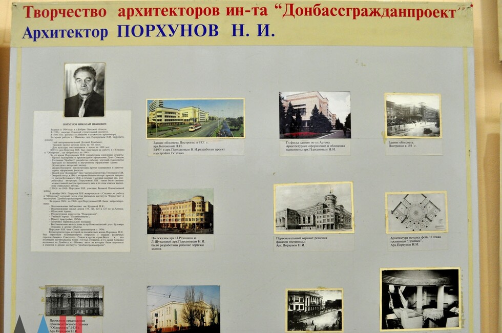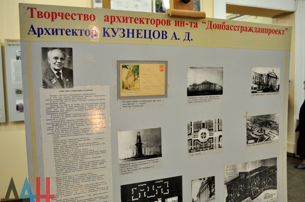 Среди экспонатов – оригинальные эскизы, редкие фотоснимки архитектуры и стройматериалы, в частности, декоративная плитка. Посетители могли лицезреть чертежи и проект Свято-Преображенского кафедрального собора, комбината «Сталинуголь», генеральный план Дома городского совета Сталино, а также фотоиллюстрации разрушенных административных и жилых построек времен немецкой оккупации.