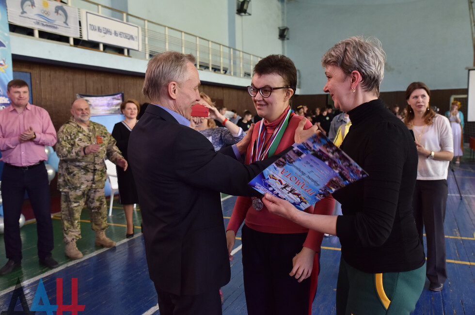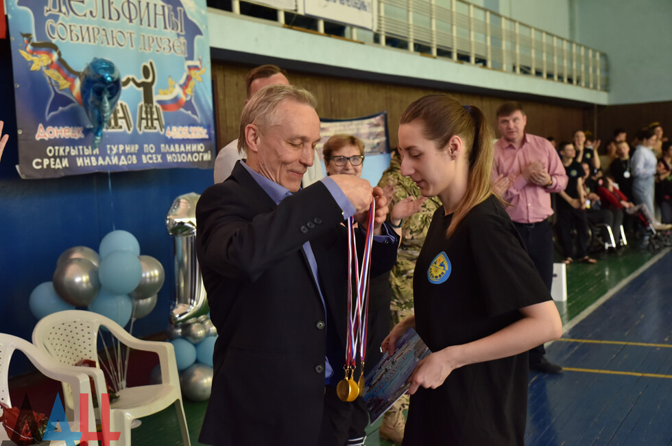 Донецк, 5 мая – ДАН. Торжественное награждение победителей Открытых республиканских соревнований по плаванию «Дельфины собирают друзей» среди людей с ограниченными возможностями здоровья прошло сегодня в спортивном комплексе «Кировец» в Донецке. Почетным гостем мероприятия стал член конституционной комиссии Белоруссии, участник Параолимпийских Игр в Токио, многократный рекордсмен мира и Европы по плаванию Алексей Талай.