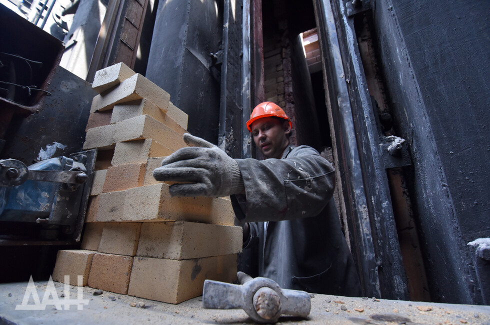В данный момент в ремонте задействовано всего 20 человек. Кладку ведет Вадим – молодой огнеупорщик. Он раньше был горняком на шахте имени Засядько, но пришлось переучиться.