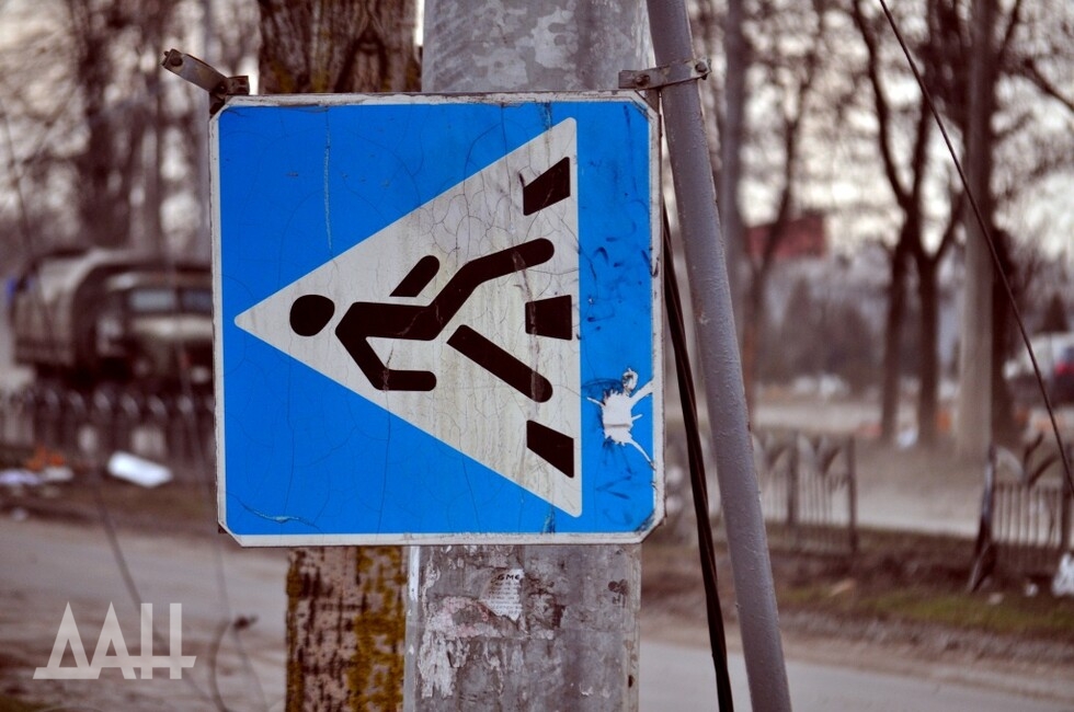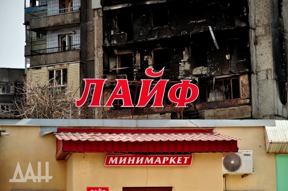 Канонада практически не прекращается. Бам, бам, бам – по огневым точкам нацистов работают мощные орудия. Денацификацией занимается и авиация, судя по шуму двигателей. То тут, то там на горизонте клубится густой дым. Сгоревшие многоэтажки с прокопченными черными стенами и окнами без стекол, оборванные провода и покосившиеся дорожные знаки, указывающие странные направления. Такой он сейчас – военный Мариуполь.