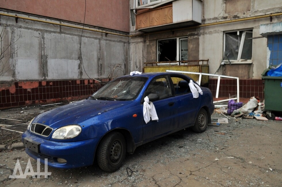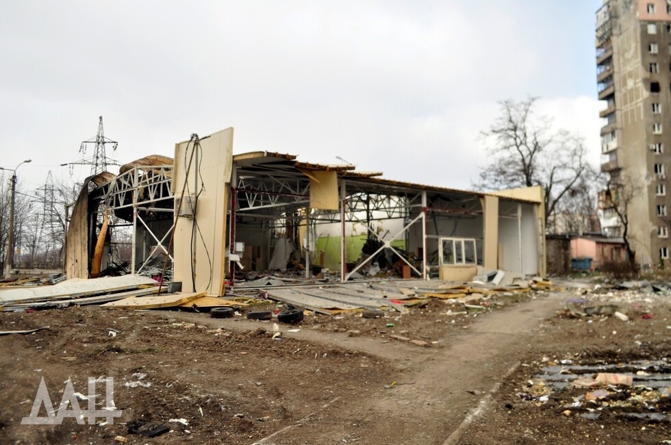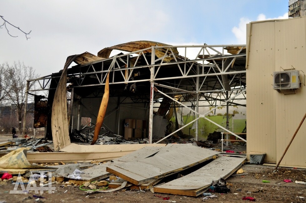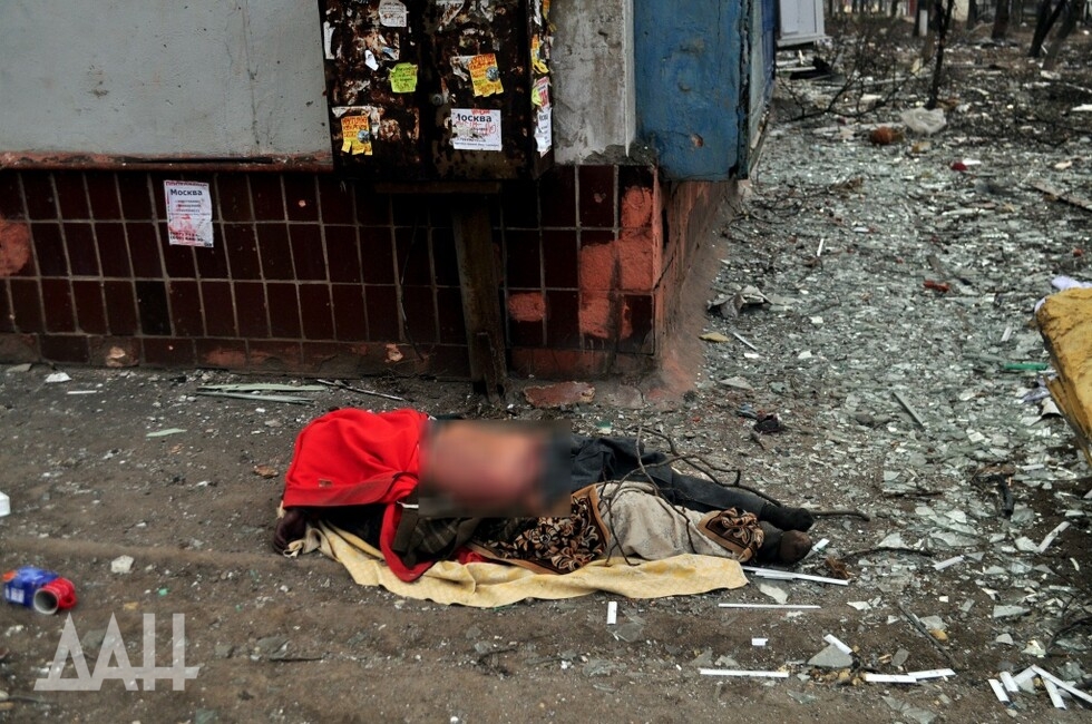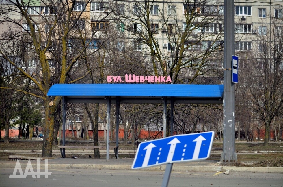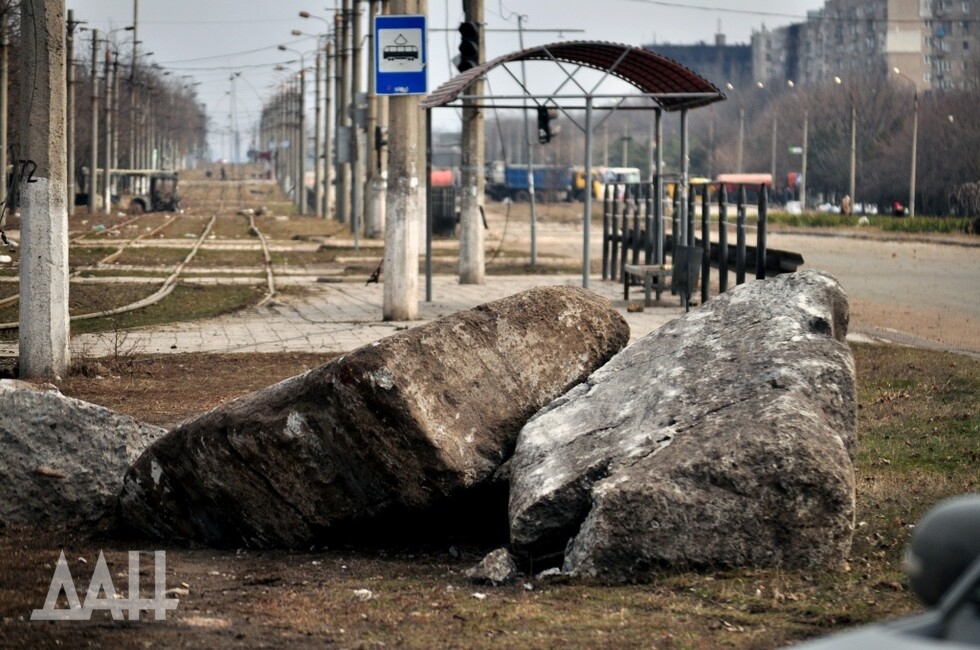 Кольцо на бульваре Шевченко. В асфальте – застрявшие хвостовики мин. Однако остановка чудесным образом уцелела – ни царапины. Вдали виднеется баррикада из грузовиков и коммунальной техники. Военные говорят, что за ней территорию пока что контролируют украинские боевики. Гражданские перемещаются между позициями ДНР и «Азова», на свой страх и риск. Лежащие на улице тела доказывают – без жертв не обходится.