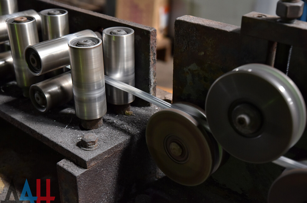 Основа производства сегодня - плавильный участок, оборудованный двумя печами по 12 тонн загрузки каждая. Нагревательные агрегаты еще до начала боевых действий были переведены с электричества на газ, что значительно экономило средства и снижало себестоимость продукции. Для выпуска алюминиевой катанки пришлось оптимизировать технологию и построить намоточный станок, который от проекта до воплощения в металле создан силами сотрудников предприятия. На прессовом участке катанка сначала проходит через этот агрегат (см. фото).