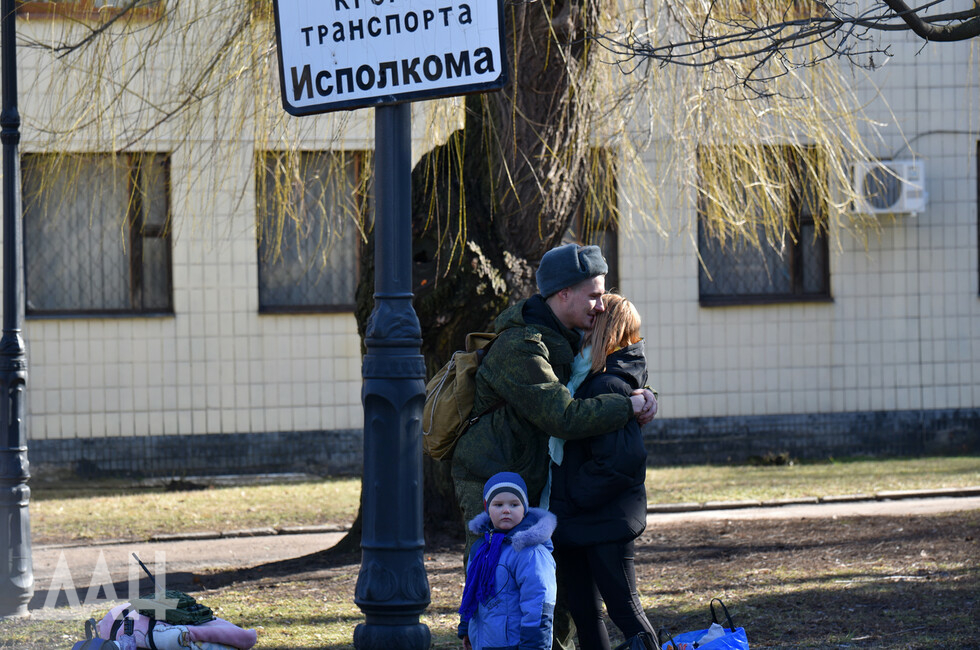Возле автобусов – сдержанное прощание, и те, кто отправляется в эвакуацию, и те, кто остается, стараются быть спокойными. Но эмоции все же прорываются слезами. Молодой парень в военной форме курит сигарету за сигаретой. Рядом – его молодая супруга и ребенок. Вспоминается строчка из старой советской песни о гражданской войне: «Дан приказ ему - на запад, ей – в другую сторону…».