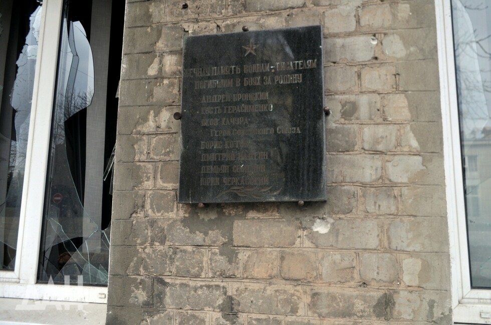 Стены и дверь Союза писателей тоже повреждены, окна скалятся острыми осколками. Внутри последствия уже в некоторой степени устранены, но работа продолжается. На стене, на фоне выбитых стекол – портреты Главы Республики Дениса Пушилина и Иосифа Сталина.