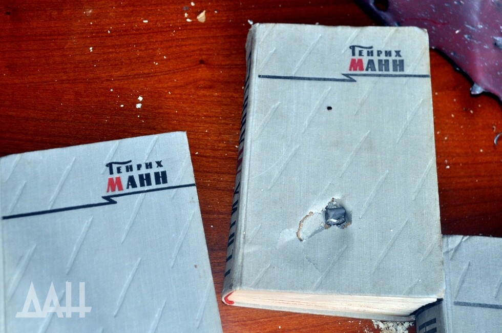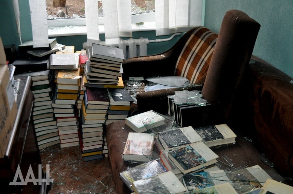 Донецк, 15 мар – ДАН. Донецкие авторы восстанавливают помещение Союза писателей ДНР после взрыва ракеты украинского оперативно-тактического комплекса «Точка-У». Ее осколки пробили стены и застряли в книгах.