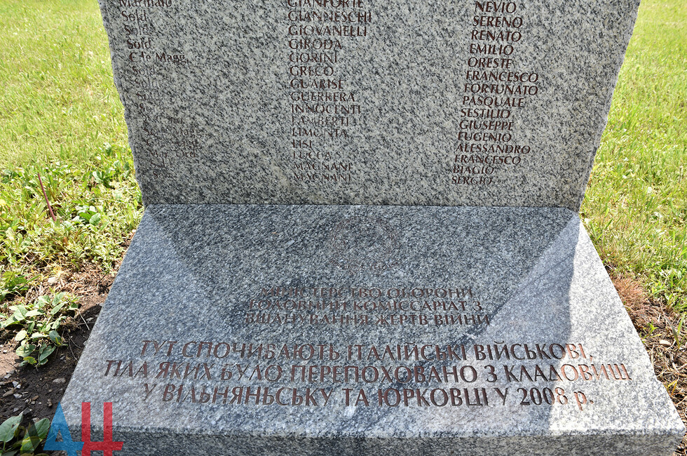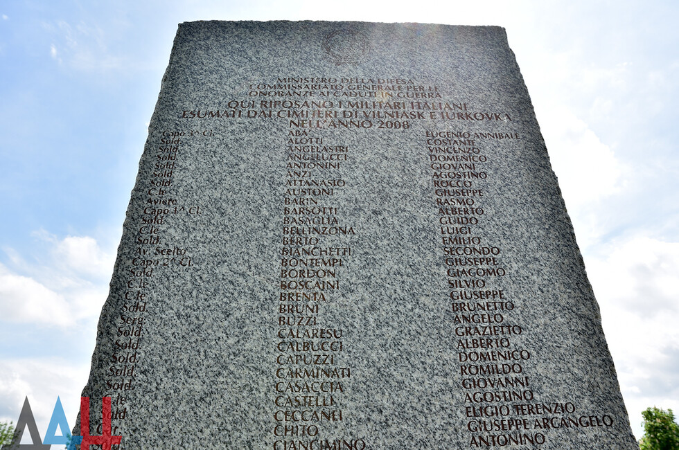 Также неподалеку от входа, слева от мощеной дорожки, возвышается мраморная плита на месте перезахоронения останков итальянских солдат, перевезенных из Запорожской области.
