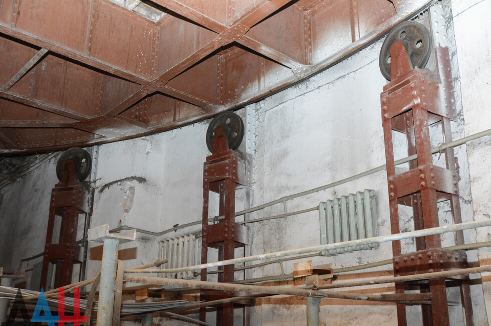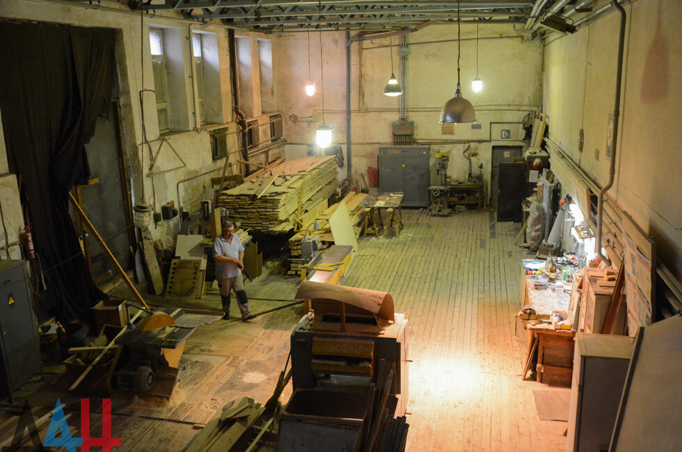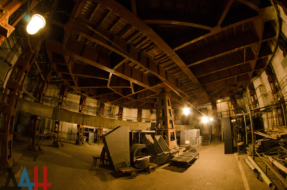 Для более детального знакомства с архитектурой «Донбасс Оперы» корреспонденты агентства обратились в театр с просьбой об экскурсии по закулисью, в том числе техническим помещениям, куда обычно доступ ограничен. В сопровождении редактора литературно-драматургической части Татьяны Мельниковой проследовали на самый нижний уровень строения – в подвальное помещение площадью 315 квадратных метров прямо под сценой. Там расположен механизм, приводящий в движение огромный поворотный круг. Он же старейшая часть и фактически сердце театра.
