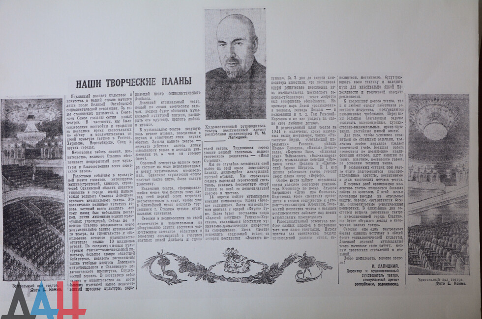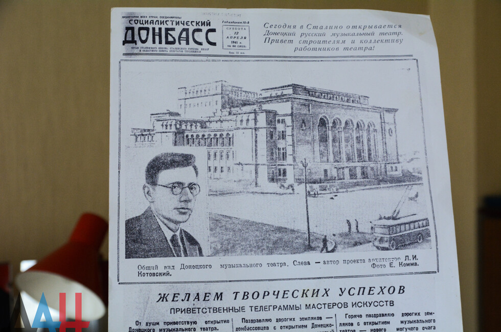Открытие здания театра состоялось 12 апреля 1941 года оперой русского композитора Михаила Глинки «Иван Сусанин». Как рассказывает Татьяна Мельникова, которая за четверть века работы в «Донбасс Опере» собрала солидный исторический архив, постановка была масштабной: для артистов пошито порядка 500 костюмов, в музыкальном сопровождении задействованы настоящие колокола, в финале на сцену выходили десятки актеров, четверо из них выезжали на конях.