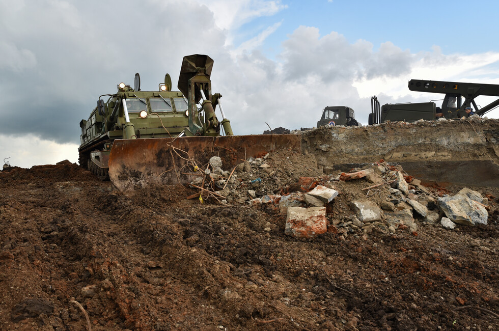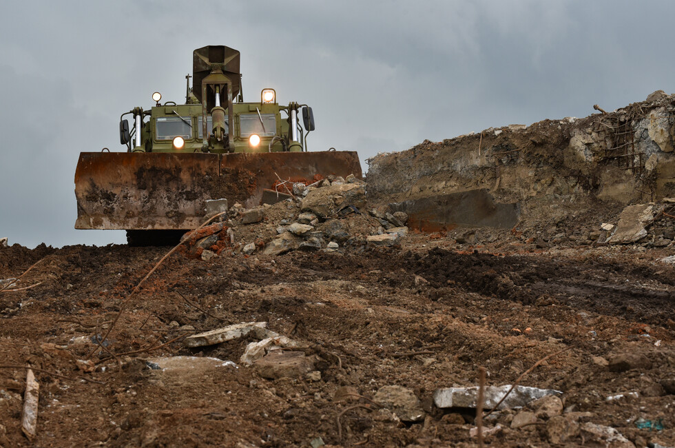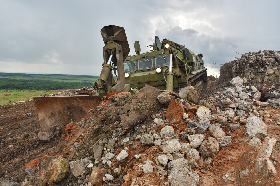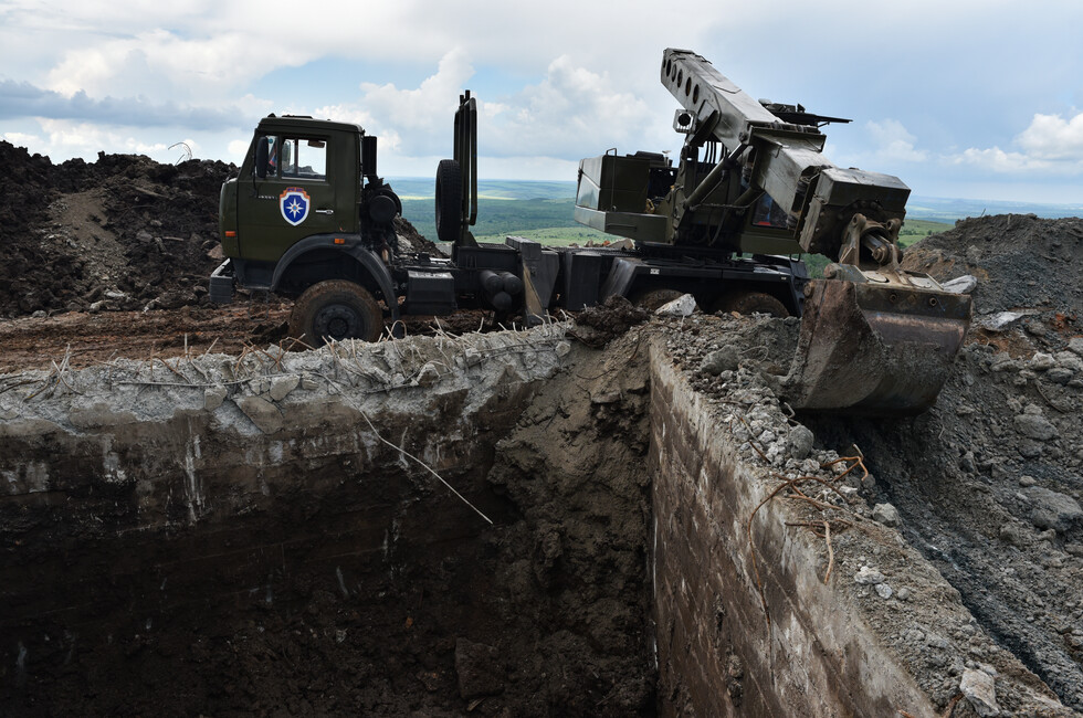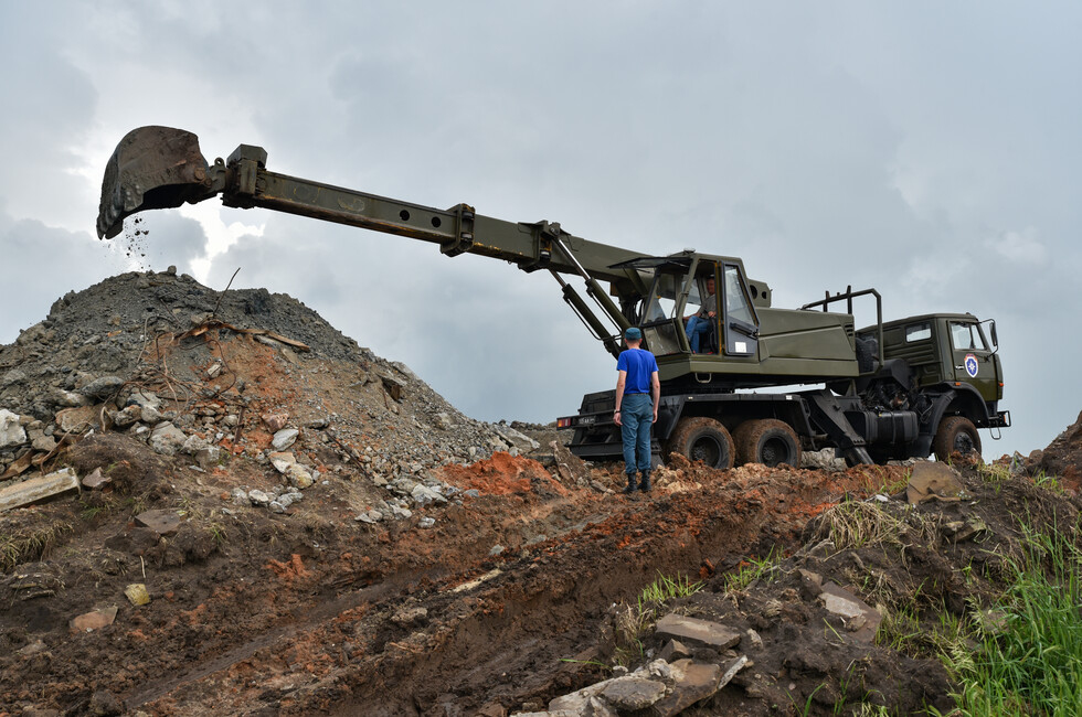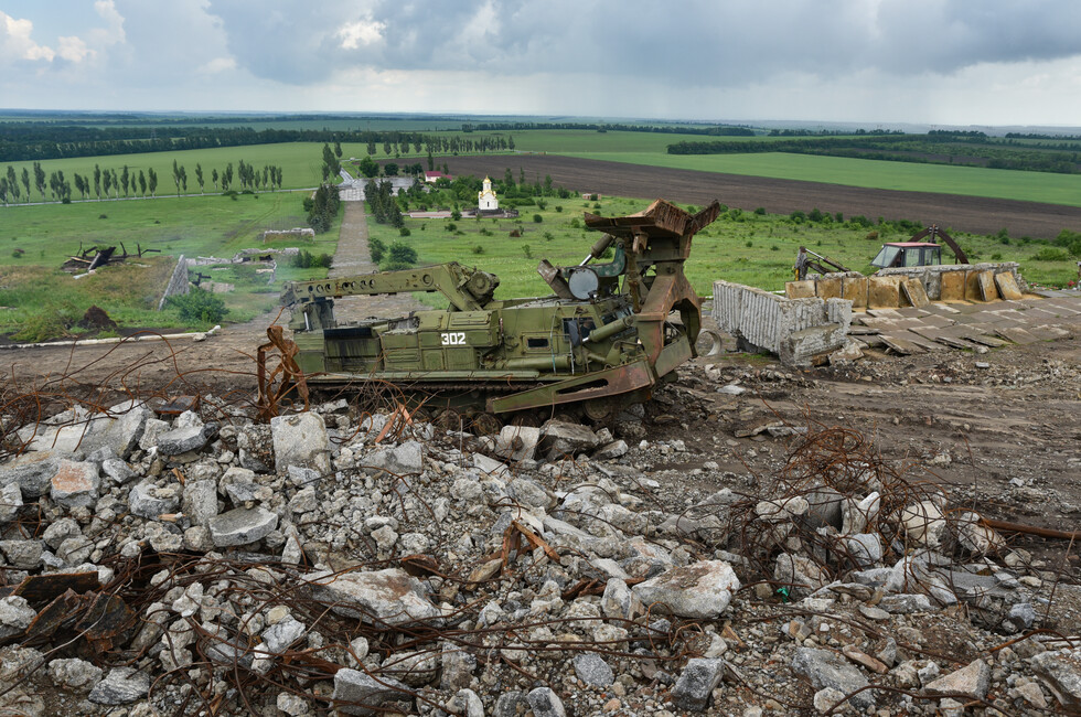 Инженерный танк БАТ-2 работает в паре с экскаватором на шасси грузовика КамАЗ. Его ковш на телескопической стреле переворачивает центнеры земли и битого камня, очищая основание стелы. Ее остатки, разбитые обстрелами украинских войск, вместе с обломками 11-метровой скульптуры солдата уже демонтированы.