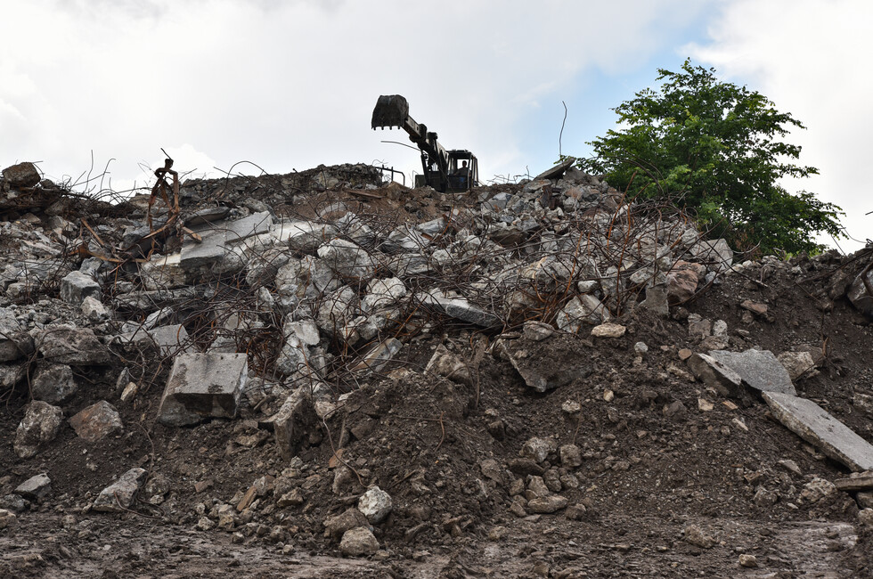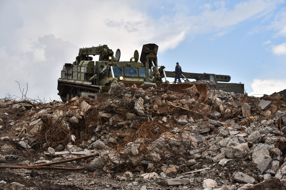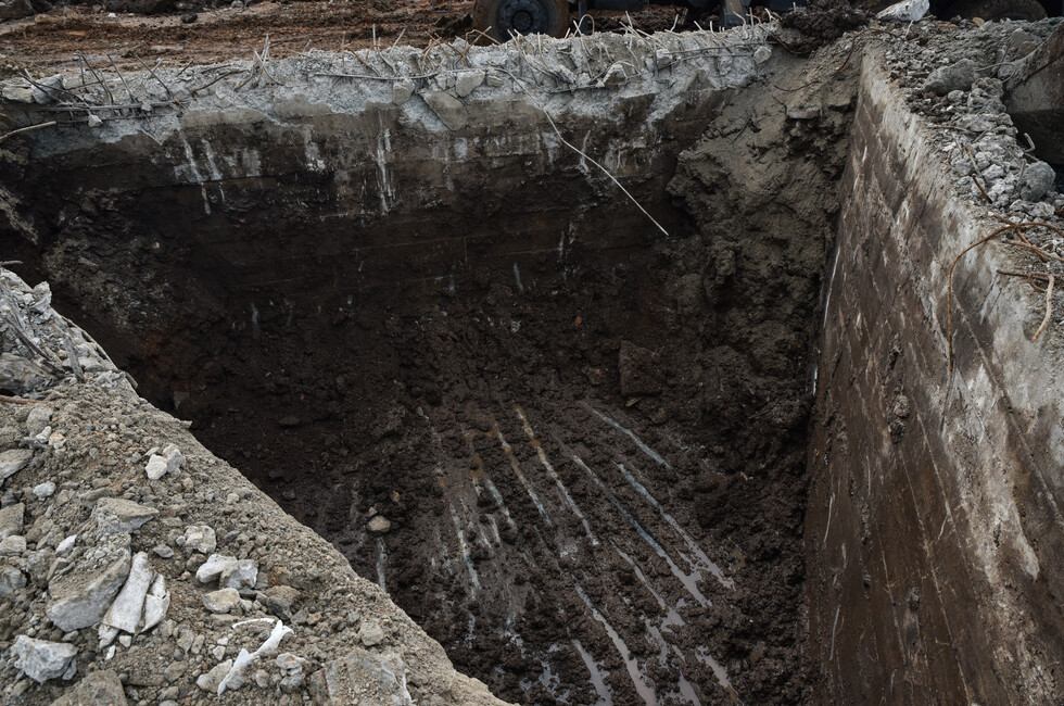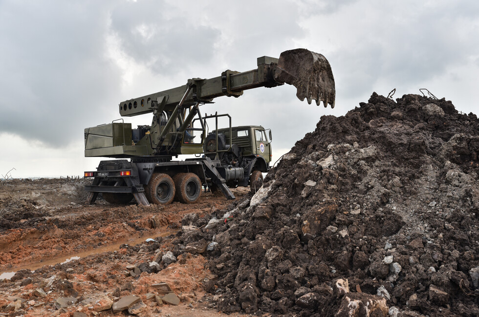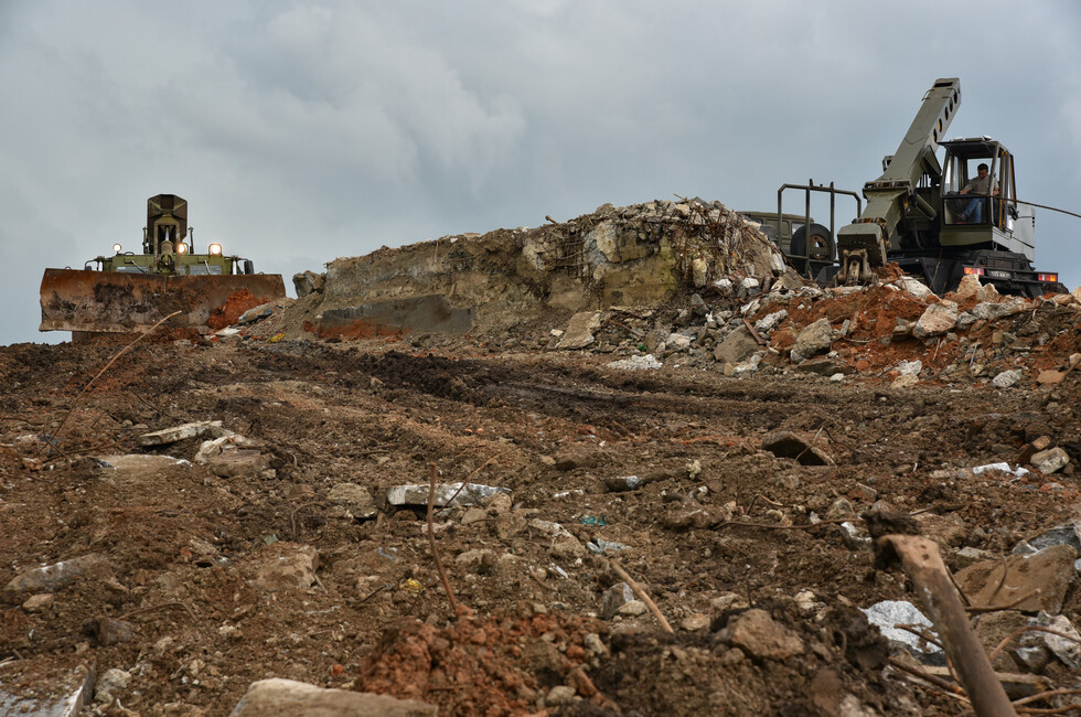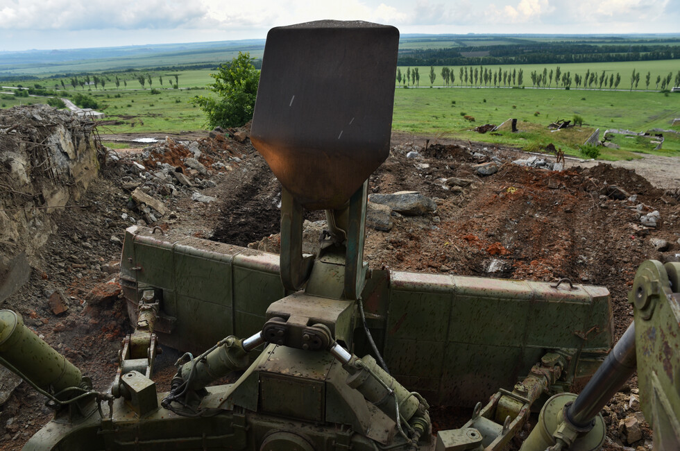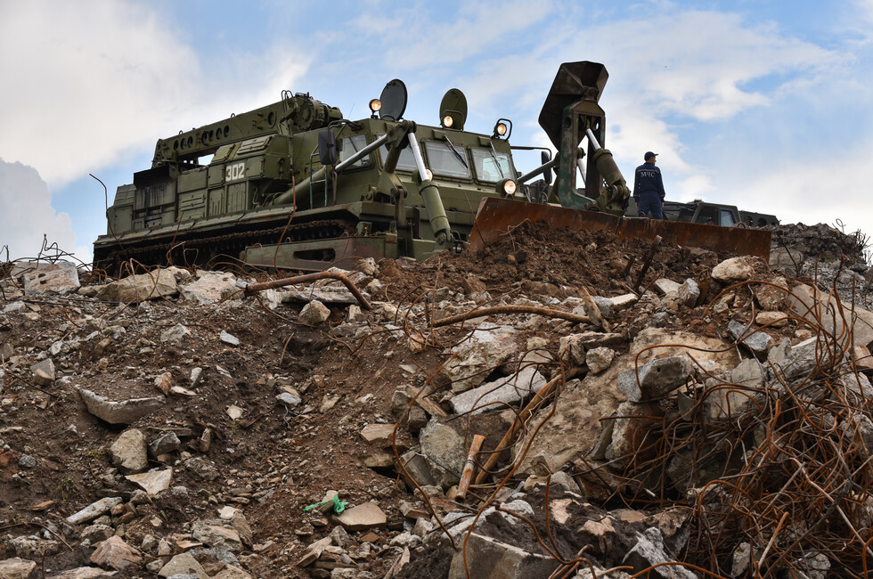 Инженерный танк БАТ-2 работает в паре с экскаватором на шасси грузовика КамАЗ. Его ковш на телескопической стреле переворачивает центнеры земли и битого камня, очищая основание стелы. Ее остатки, разбитые обстрелами украинских войск, вместе с обломками 11-метровой скульптуры солдата уже демонтированы.