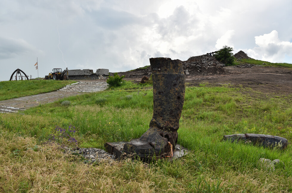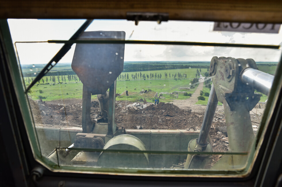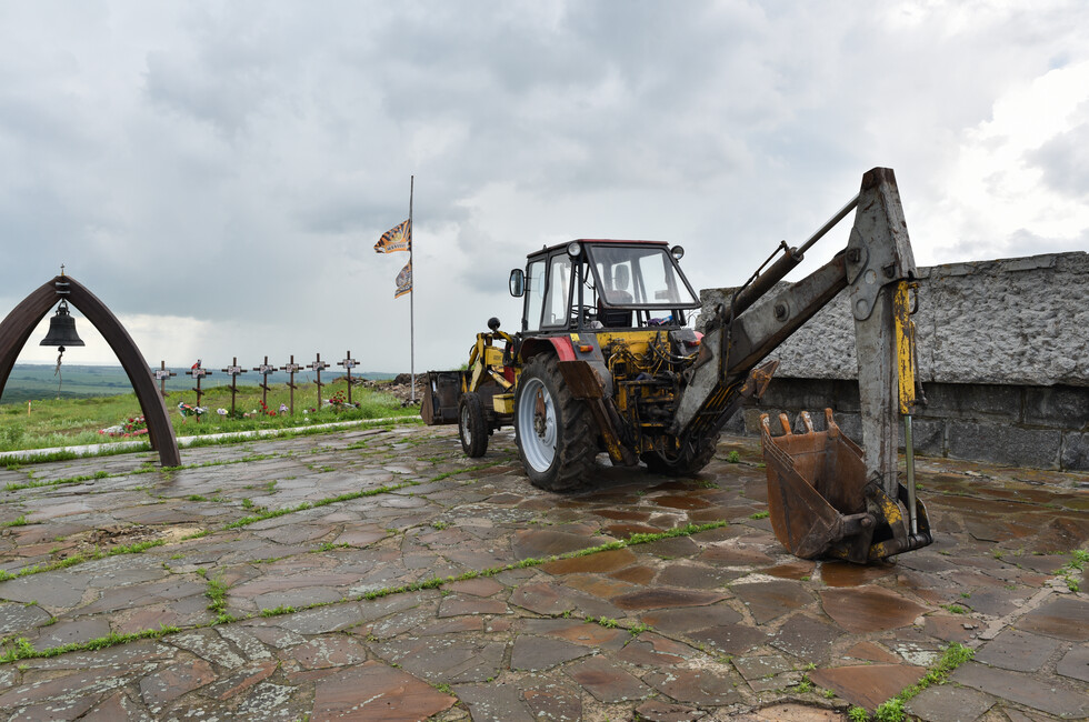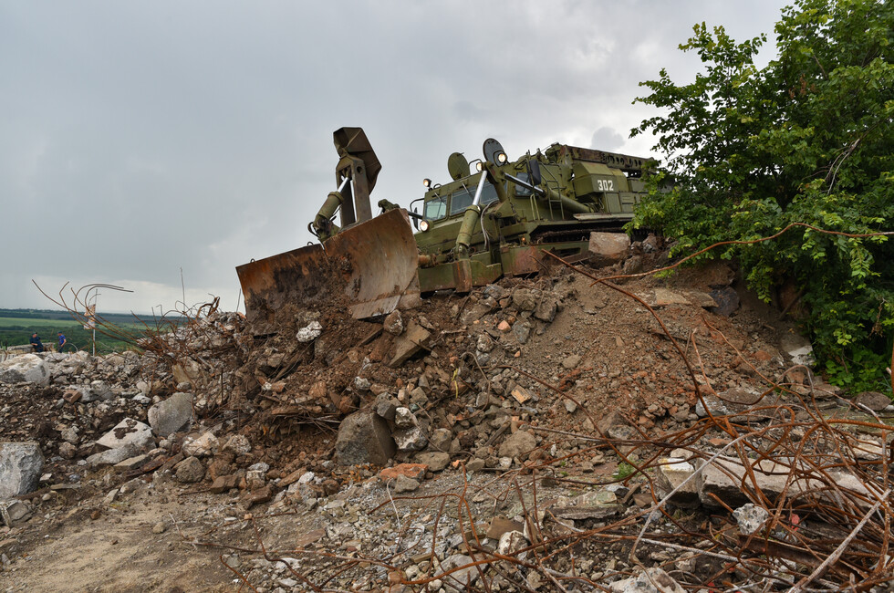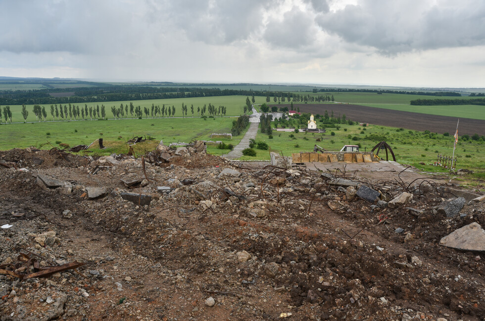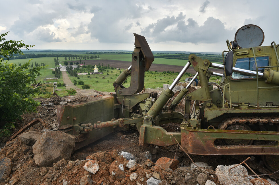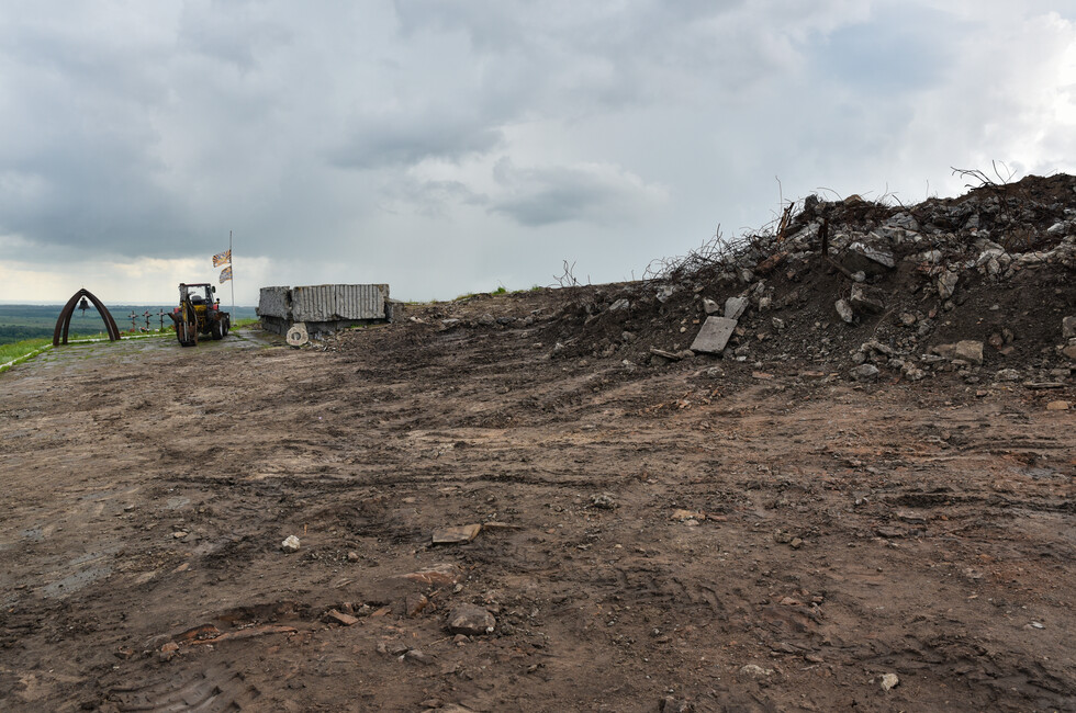 Сейчас над Саур-Могилой снова раздается грохот и рев дизелей, но это – добрая сила, направленная не на разрушение, а на созидание. Тяжелая инженерная техника МЧС ДНР ведет расчистку завалов на верхнем плато мемориального комплекса. Бетонное крошево, куски стальной арматуры, десятки тонн потревоженной взрывами земли с трудом поддаются мощи тяжелого гусеничного путепрокладчика БАТ-2, который бульдозерным отвалом очищает площадку.