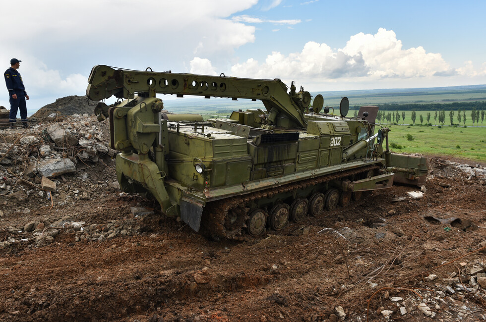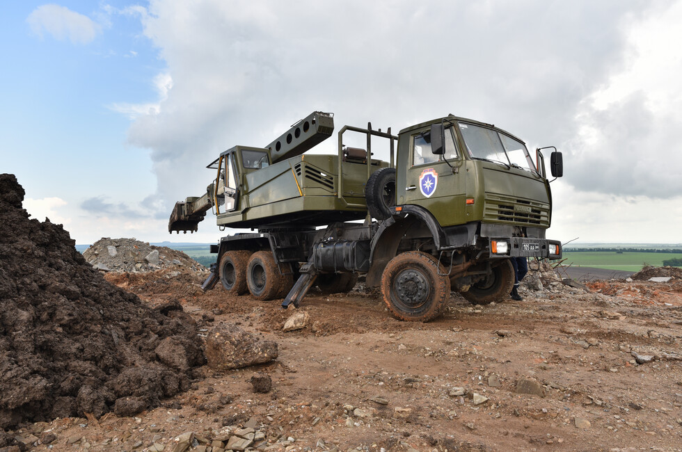 Это – самая мощная единица из всей задействованной здесь спасательным ведомством ДНР техники. Инженерным танком 40-тонная бронированная махина названа не зря, для нее практически не существует непроходимого пути. БАТ-2 и сам способен прокладывать дороги. Инженерный танк упирается в землю массивным отвалом и просто двигается вперед с тяжеловесной грацией динозавра. Ход у инженерного танка удивительно плавный: он лишь мягко покачивается на рытвинах, в которых застряла бы любая колесная техника. Танковый дизель в 700 лошадиных сил обеспечивает необходимый запас мощности. Кажется, что БАТ-2 способен сдвинуть горы.