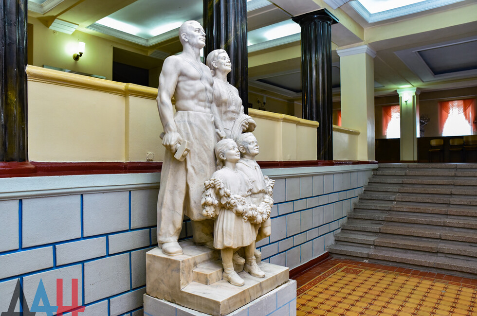Еще один уникальный артефакт ожидает посетителей в фойе ДК. У подножия лестницы расположена мраморная скульптура, изображающая в полный рост семью: отца с матерью и сына с дочкой. В руках у главы семейства – молот, как символ рабочего класса. Обращает на себя внимание и рельефность мышц мужской скульптуры. Женщина рядом держит в руках колосья хлеба, как символ крестьянства. У детей в руках венок, сплетенный из цветов и гроздей винограда. Лица всех четверых светятся счастьем, их взгляды устремлены, несомненно, в светлое будущее.