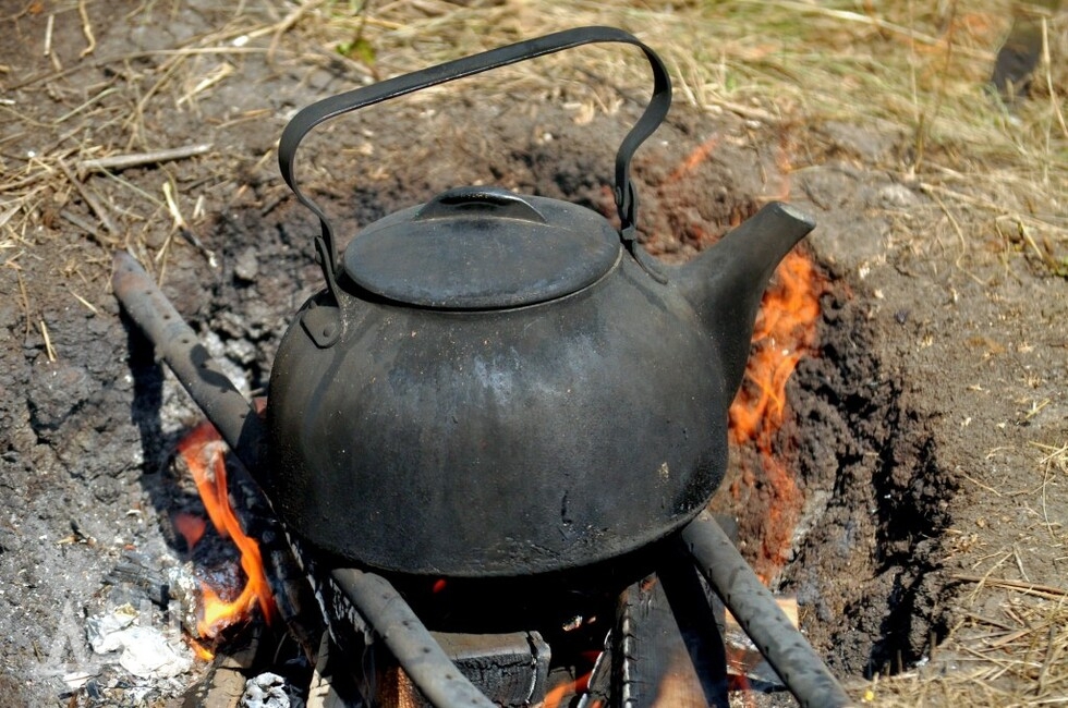 В лесополосе на поляне сидят солдаты на ящиках от снарядов и гильз. На костре греется черный от копоти чайник. «Может, чайку?» — предлагают они гостям-журналистам. Вместе с ними ждем, пока разведка сообщит координаты очередной цели.