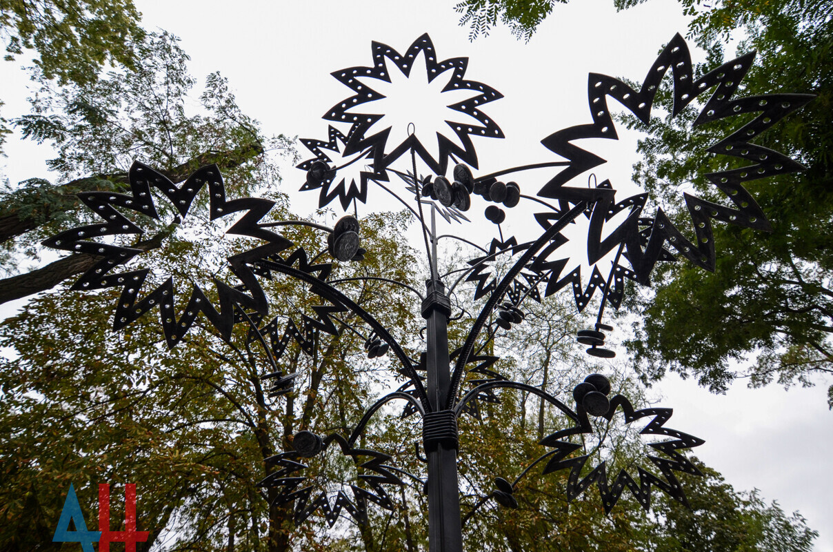 Наконец, переходим к одному из главных символов Донецка, который буквально ассоциируется с городом — пальме Мерцалова. Оригинальная пальма Мерцалова была выкована в конце XIX века из цельного куска стального рельса. Её авторы — кузнец Юзовского металлургического завода Алексей Мерцалов и молотобоец Филипп Шкарин. Высота композиции — 3,5 метра, вес — 325 килограммов. В 1900 году она получила Гран-при на Парижской выставке. Сегодня это изображение стало центральной частью герба Донецкой области. Оригинал хранится в Горном институте Санкт-Петербурга.
