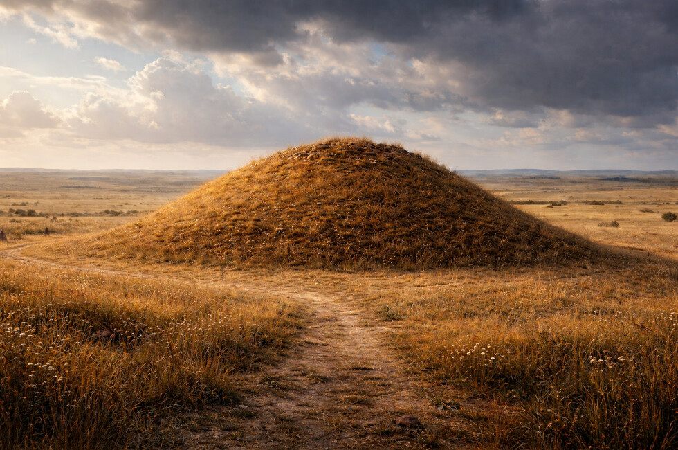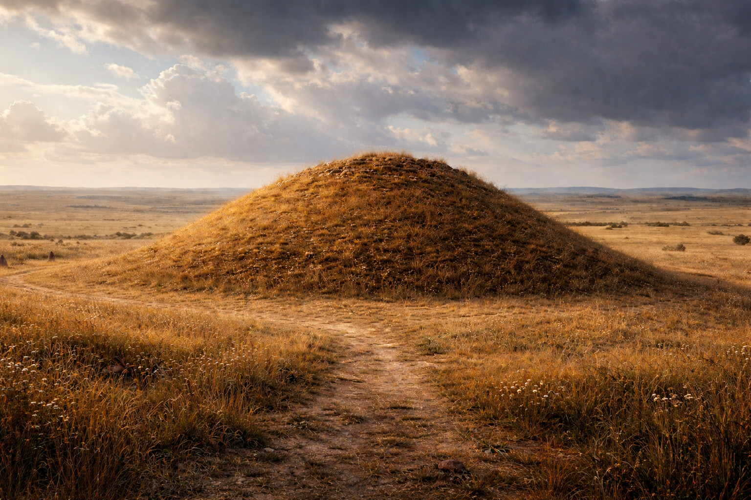Двугорбая Могила — грандиозное сооружение высотой более 5 метров и диаметром до 60 метров. На вершине кургана в древности стояла каменная скифская фигура, а насыпь была укреплена большими каменными плитами. Под ней обнаружили могилу, где лежали пять слуг. Рядом находились ямы с инвентарём: большой бронзовый котел на одной ножке с костями ягнёнка, 19 остродонных греческих амфор и остатки деревянной колесницы. В центре площадки вырыли входную шахту глубиной 10 метров, от которой отходили две камеры с погребением богатого скифского аристократа. Увы, обе камеры оказались начисто ограблены в древности — при раскопках нашли грабительский лаз от края насыпи прямо к своду. Такая участь постигла практически все царские погребения.