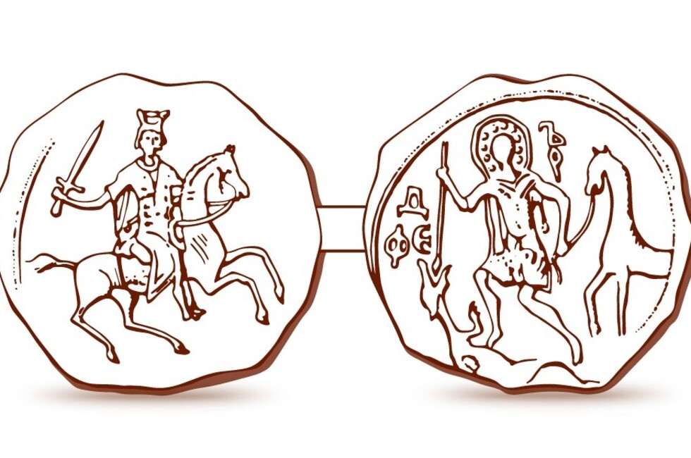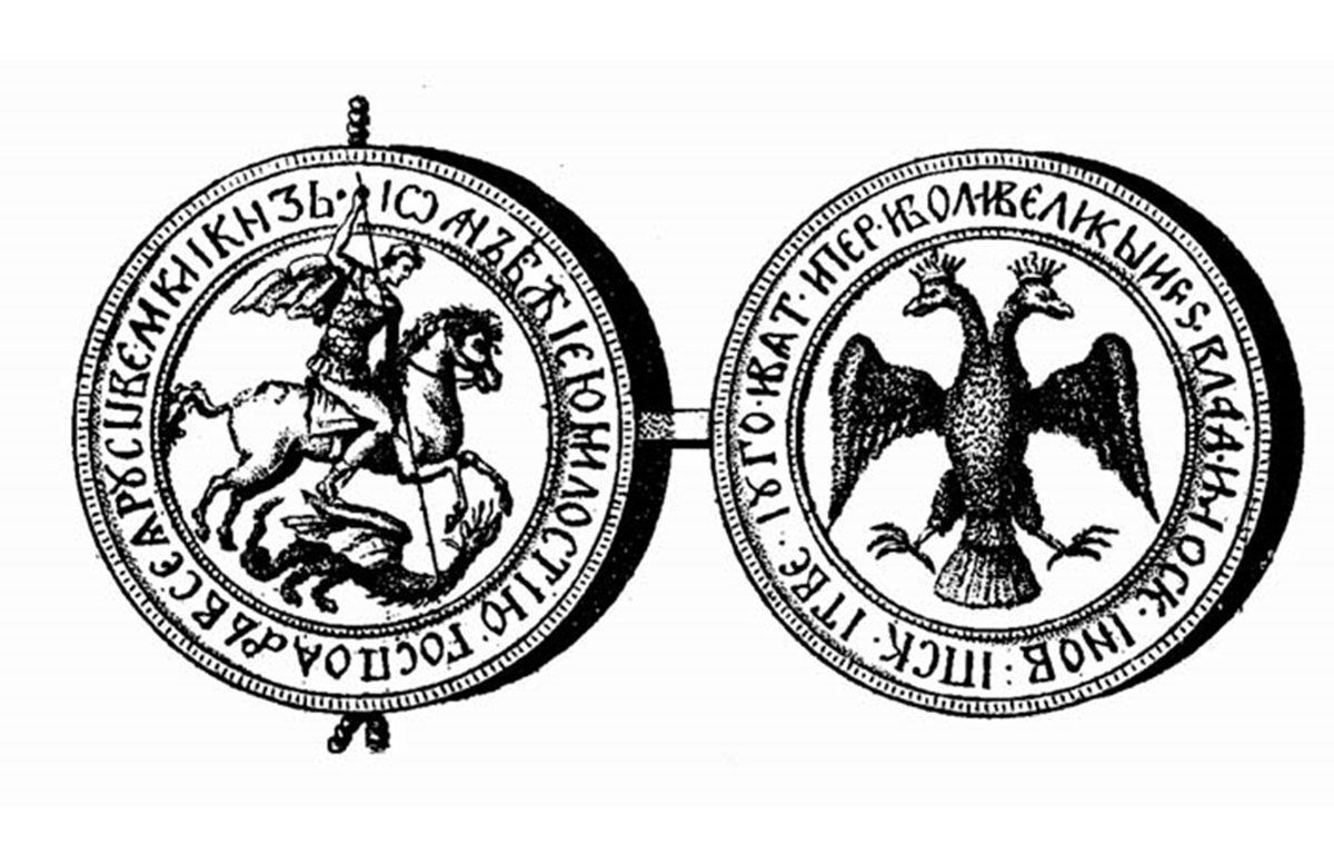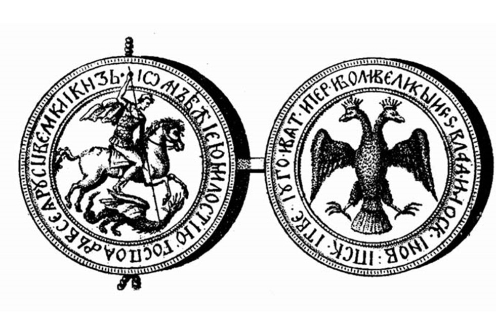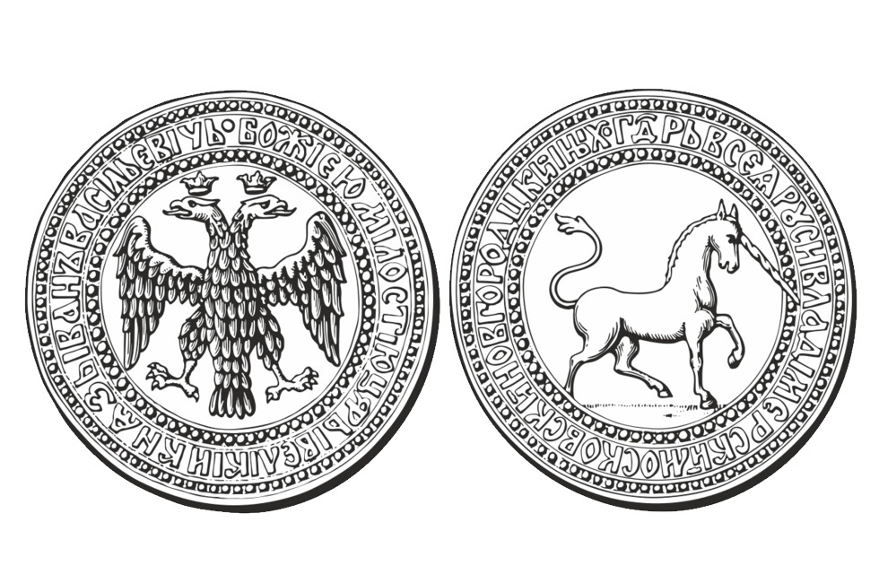 В ходу были и другие образы — например, всадника с соколом, единорога или льва, терзающего змею. Только в середине 15 века при Иване Третьем змееборец окончательно утвердился в качестве герба. Его изобразили на печати государя. На ее вторую сторону тогда же нанесли другой знак — двуглавого орла.