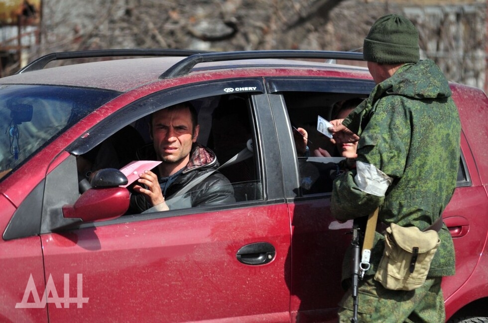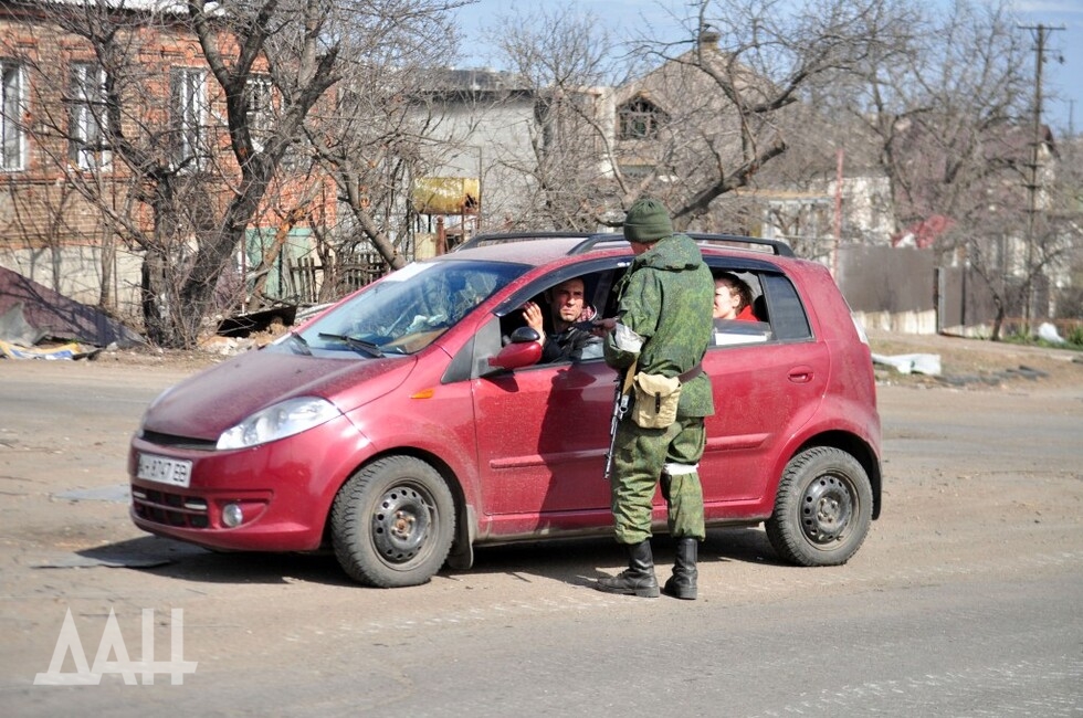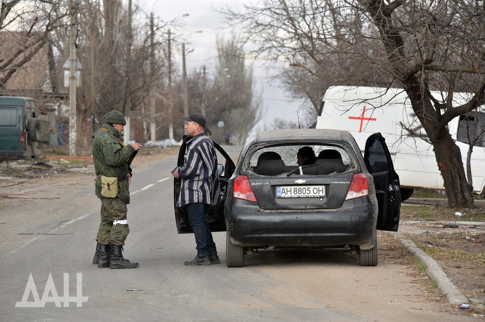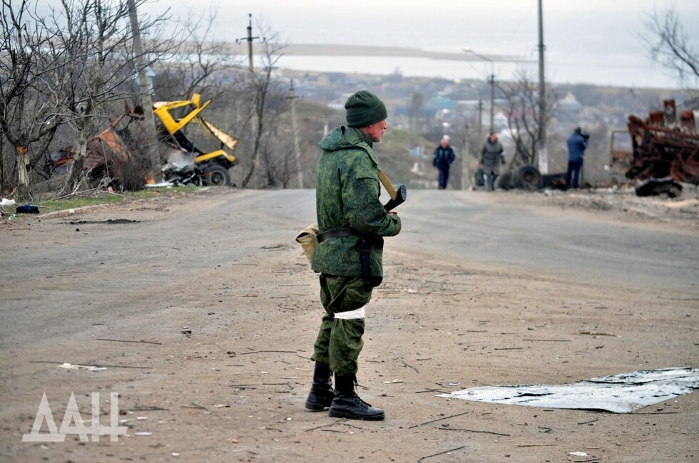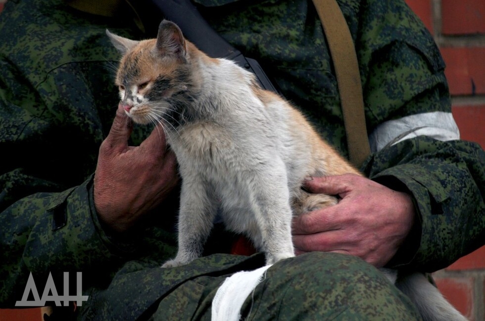 На выезде из города стоят военнослужащие ДНР – проверяют автомобили и пешеходов. Но толп и очередей на Левом Берегу нет. У блокпоста в Виноградном людей тоже не так много, как было раньше. Очереди – ближе к Широкино и Безыменному, а тут выехала большая часть тех, кто хотел, остальные решили остаться. Гражданских и военных объединяют белые повязки, как опознавательный знак – свои. К солдатам прибилась кошка бело-рыжая, фронтовая – черного цвета в окрас добавила сажа пожарищ. Кошка ласковая, легко идет на руки, и будто совсем не замечает грохота орудий – тоже привыкла.