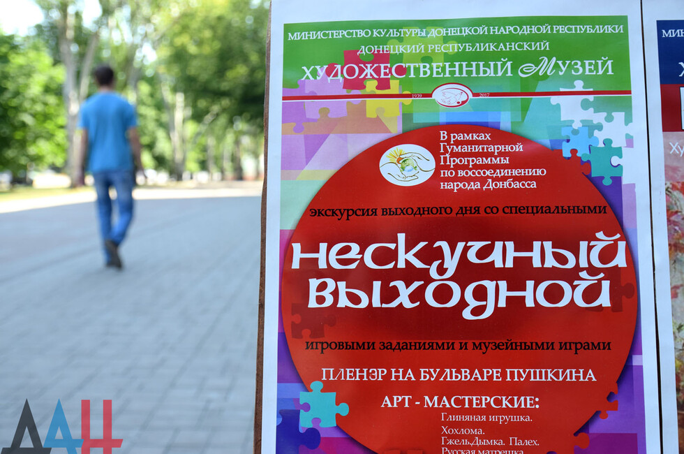 «Нескучный выходной» — это социально-культурная акция, которая проходит (с 1 июня текущего года) под патронатом Минкультуры ДНР в рамках гуманитарной программы по воссоединению народа Донбасса. В ее рамках для жителей ДНР и подконтрольной украинским властям части Донецкой области организовываются образовательно-просветительные мероприятия, нацеленные, прежде всего, на развитие творческих и интеллектуальных способностей молодежи.