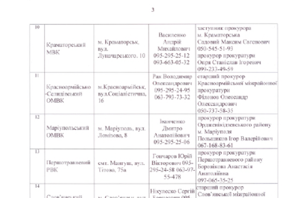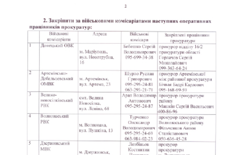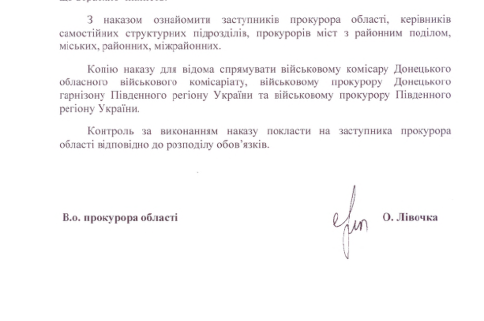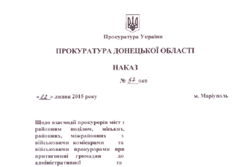 «Во время проведения частичной мобилизации, согласно указу президента Украины №15/2015 от 14.01.2015 «О частичной мобилизации», обеспечить при взаимодействии с сотрудниками военной прокуратуры Донецкого гарнизона южного региона Украины предоставление консультативно-методичной помощи военным комиссарам при привлечении граждан к административной и уголовной ответственности за нарушение законодательства о военной обязанности и военной службе», - говорится в первом пункте документа.