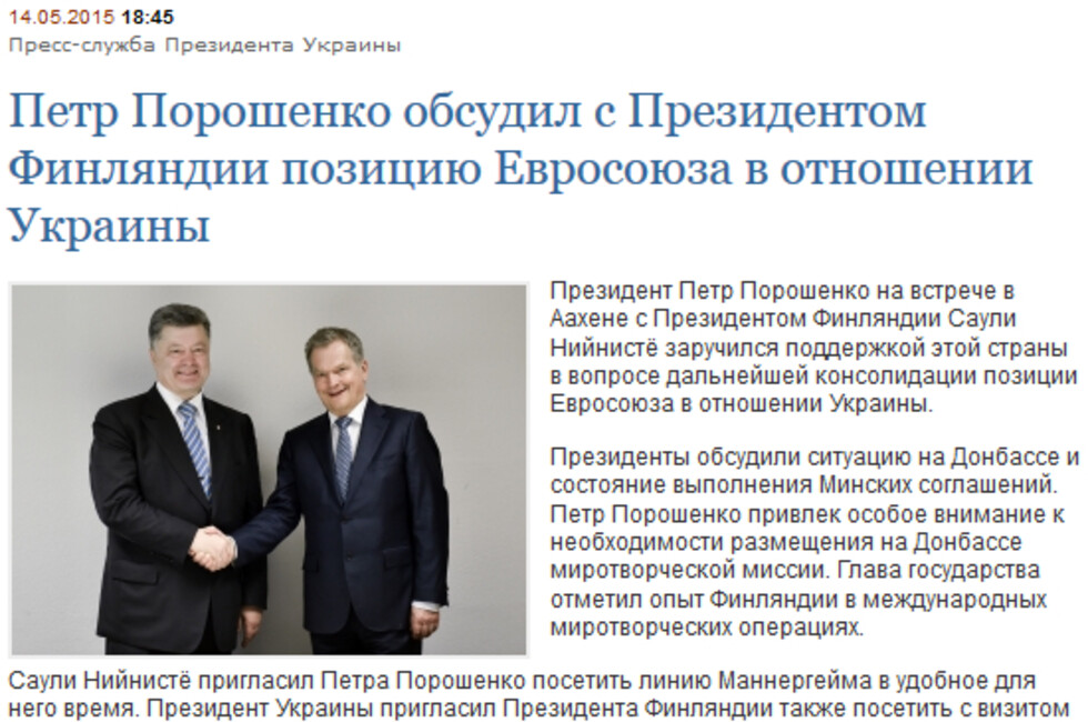 Сообщение о том, что "Саули Нийнистё пригласил Петра Порошенко посетить линию Маннергейма в удобное для него время", опубликовано на сайте украинского президента вечером 14 мая.