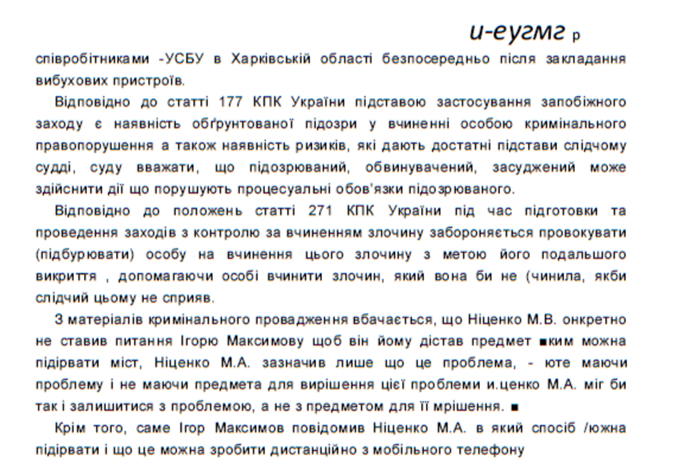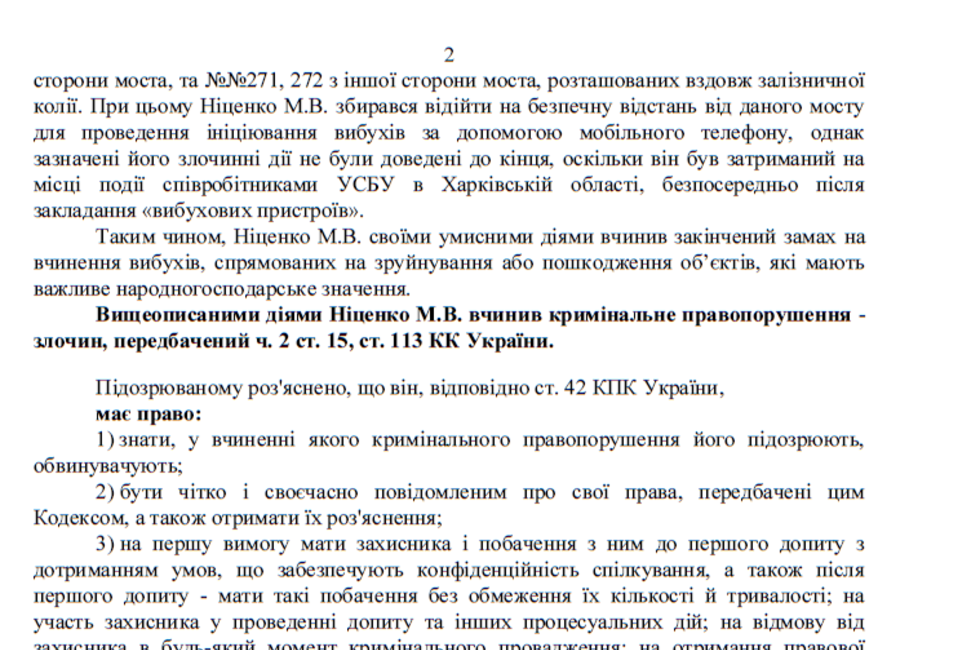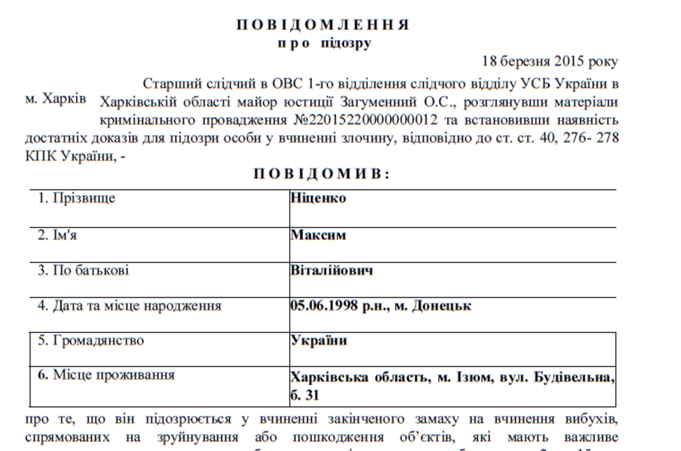Получив согласие подростка, вербовщики привезли его ночью к мосту под Изюмом, вручили муляж, после чего Ниценко сразу же был задержан сотрудниками СБУ. При этом сами организаторы «преступления» в качестве обвиняемых по делу не проходят.