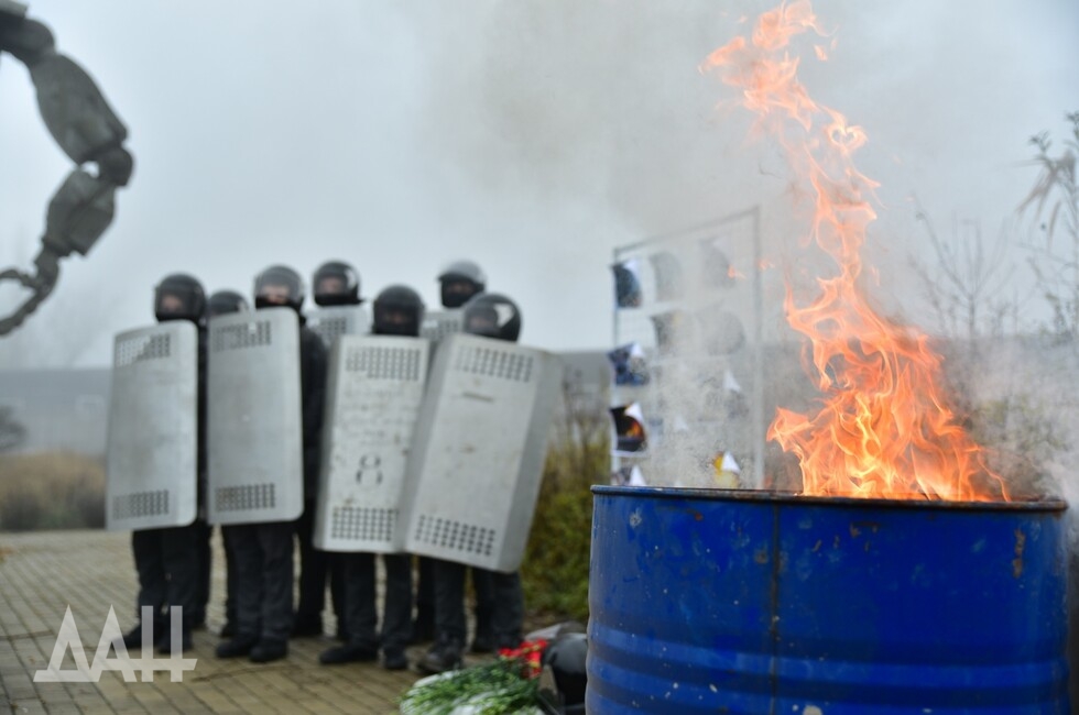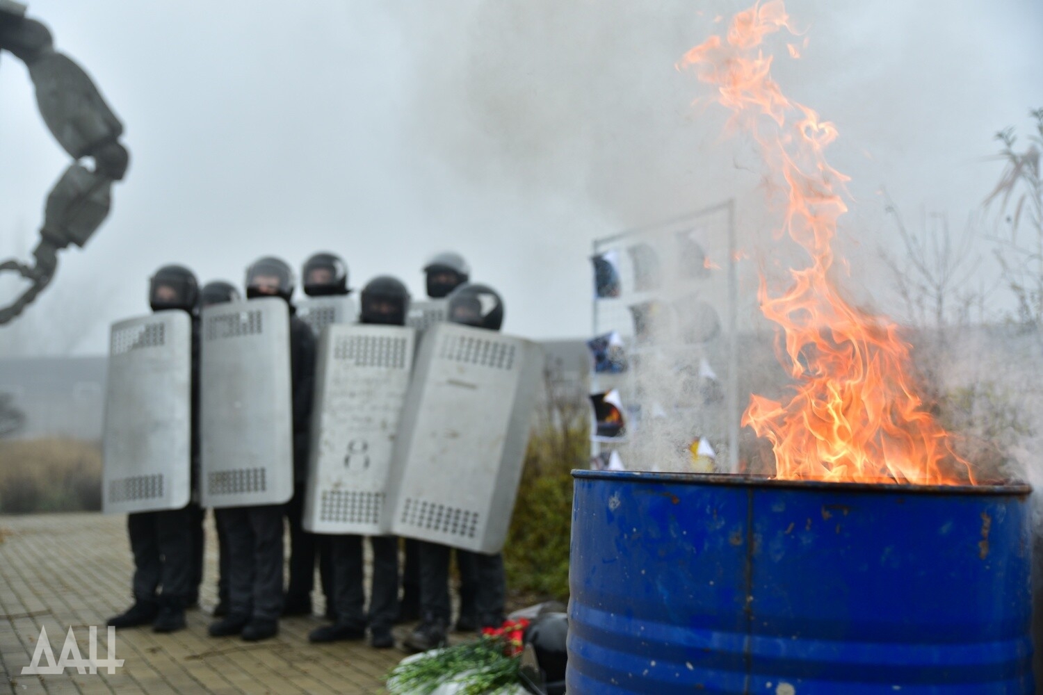 Мероприятие прошло в одном из районов Донецка, где в этот день был установлен стихийный мемориал, состоящий из фотографий с «беркутовцами», а также щита и шлема, которые помогали бойцам защищаться от камней, цепей, перцовых баллончиков, «коктейлей Молотова», применяемых украинскими националистами. Напомним, преступные действий радикалов привели к гибели порядка 20 правоохранителей, а сотни получили ранения.