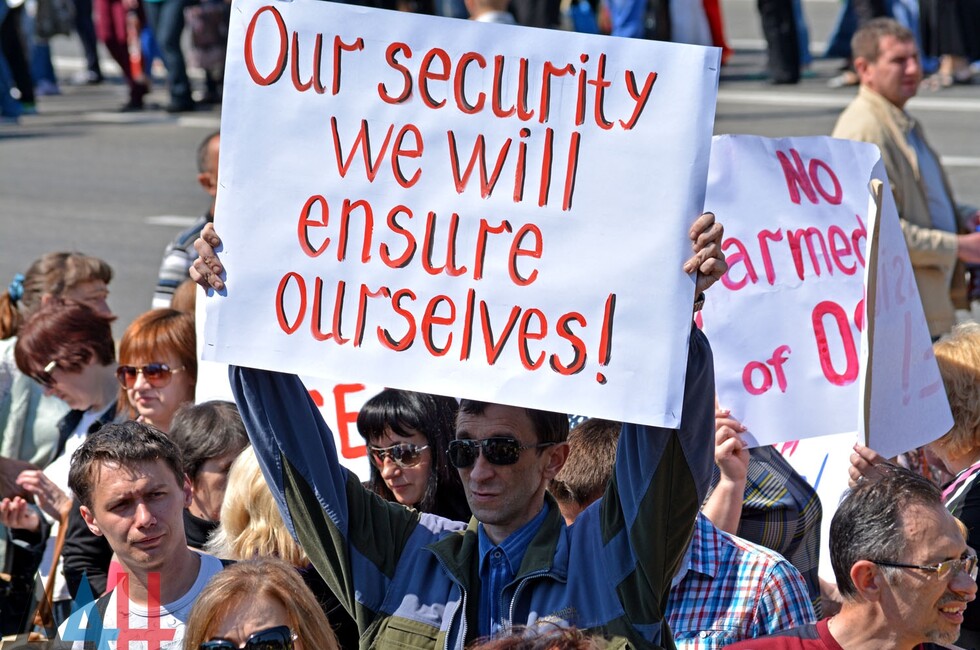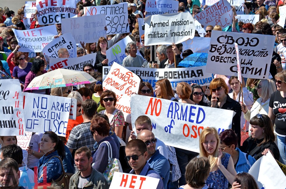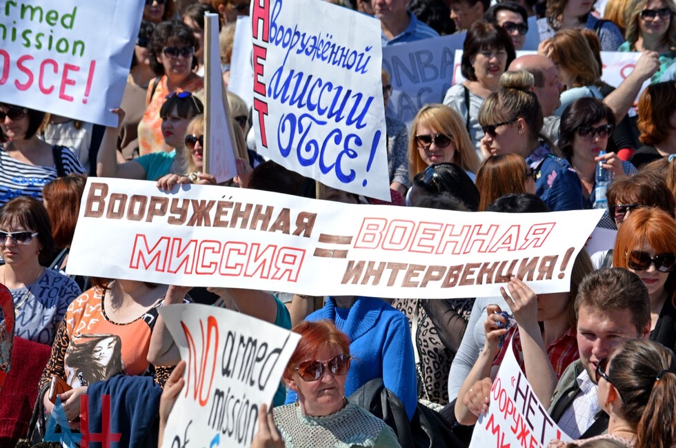 Донецк, 10 июн - ДАН. Митинг против введения в Донбасс вооруженной миссии ОБСЕ, по наблюдениям корр. ДАН, собрал сегодня в центре Донецка 30 тысяч жителей из разных городов Республики.