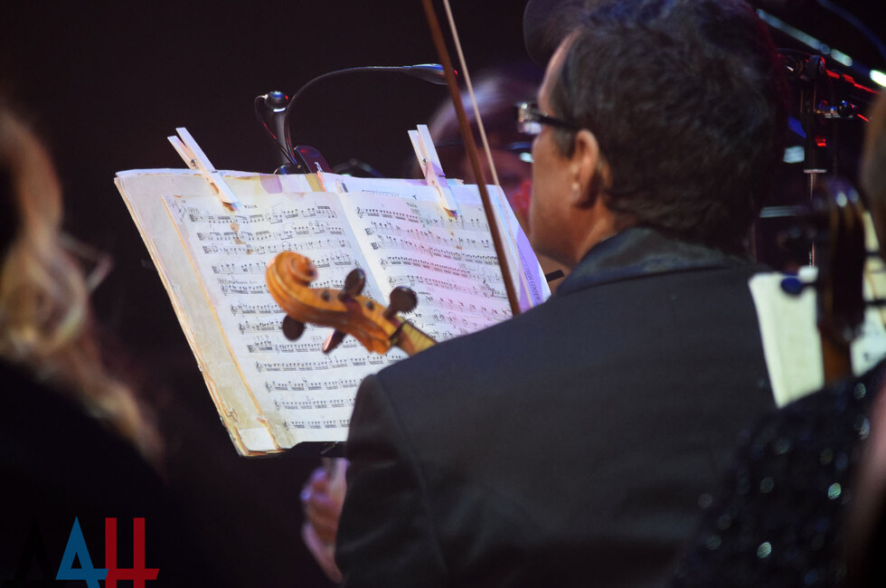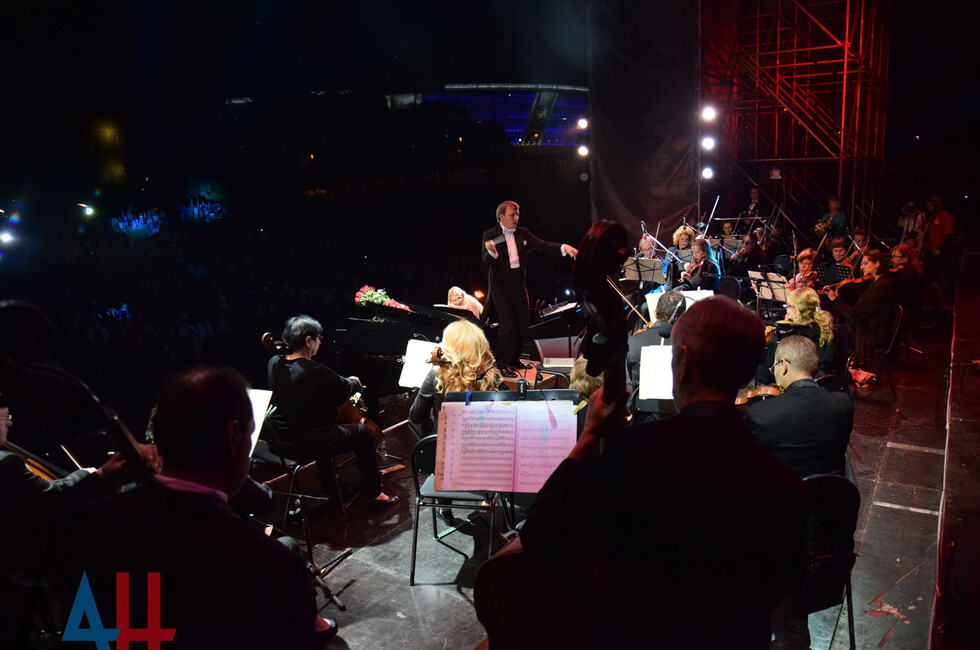 Праздничный вечер начался с выступления донецкого оркестра, который исполнил симфонию №4 Петра Чайковского, «Тройку» Георгия Свиридова и «Грозу» Антонио Вивальди. Последняя композиция сопровождалась ярким файер-шоу у сцены. После этого к столичным музыкантам присоединилась Валентина Лисица, которая открыла свое выступление сонатой для фортепиано №14 Людвига ван Бетховена.