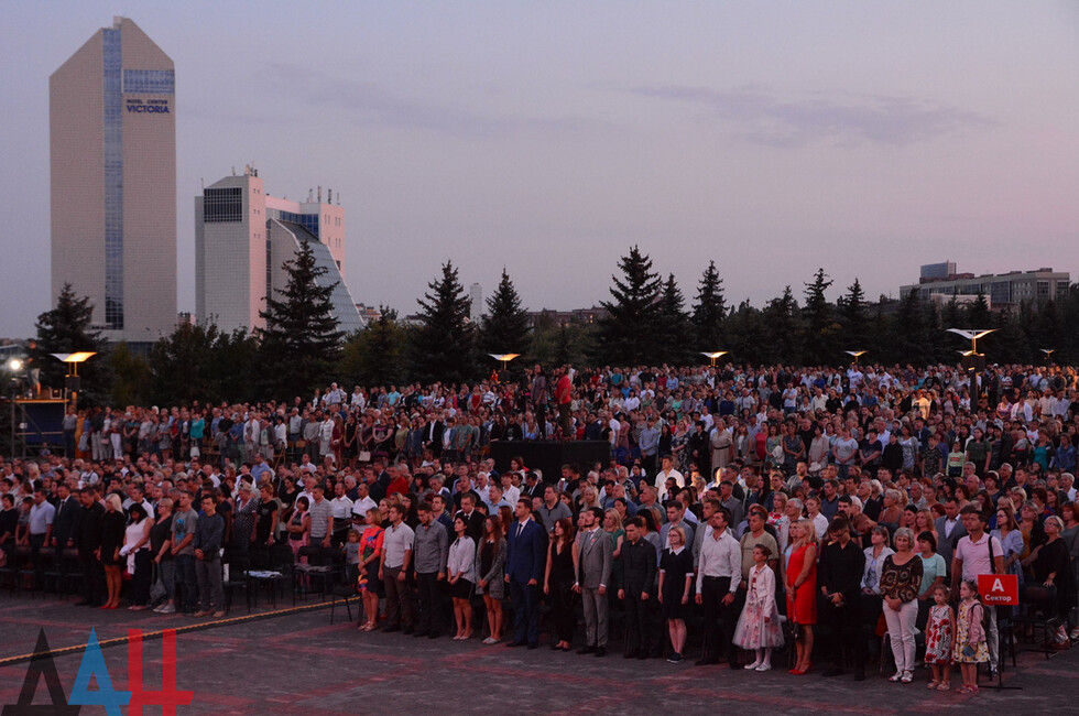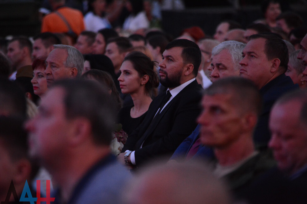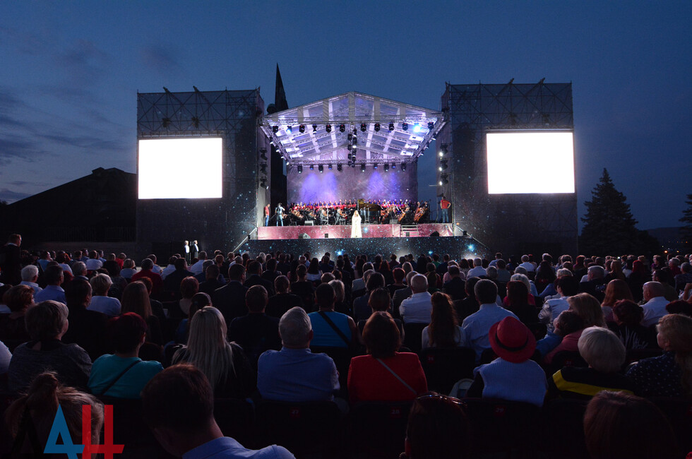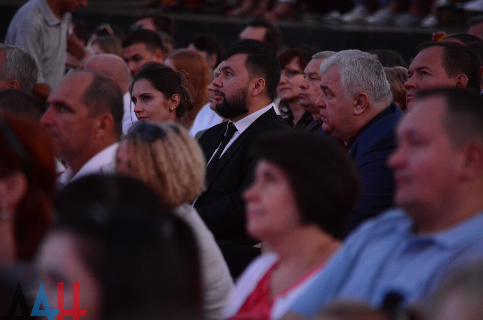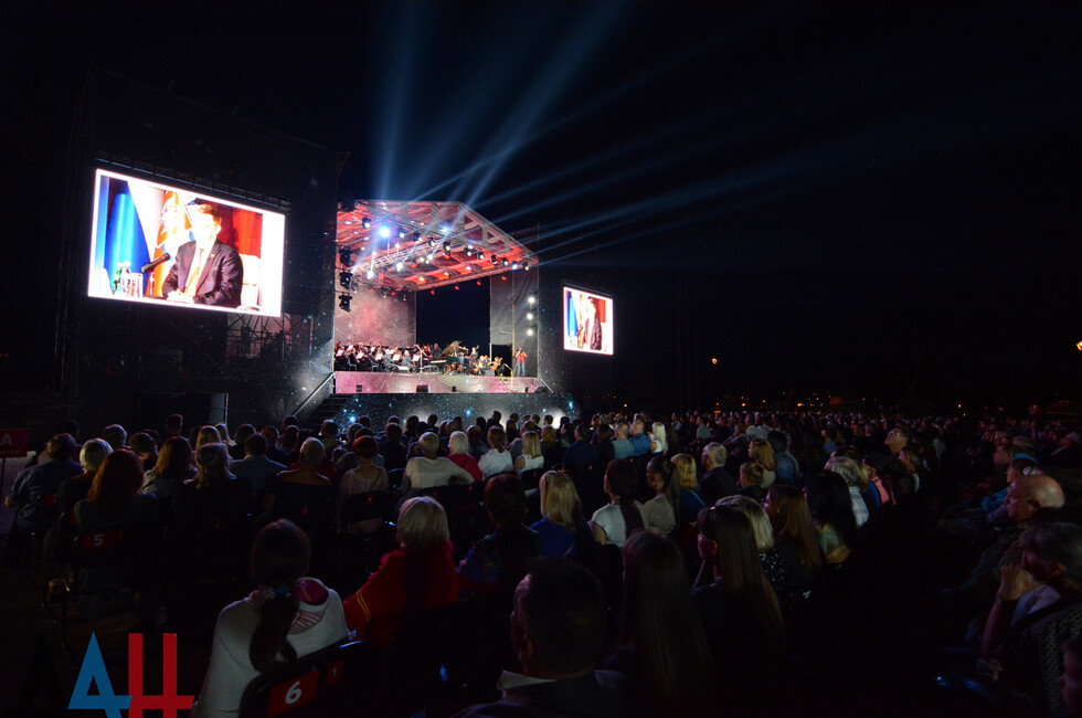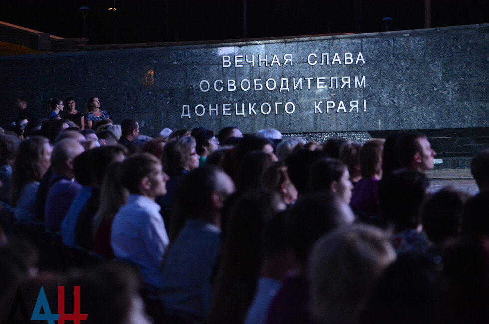 Для проведения концерта у подножия мемориала была оборудована сцена с двумя экранами. На мероприятие пришли тысячи человек, в их числе Глава ДНР Денис Пушилин.